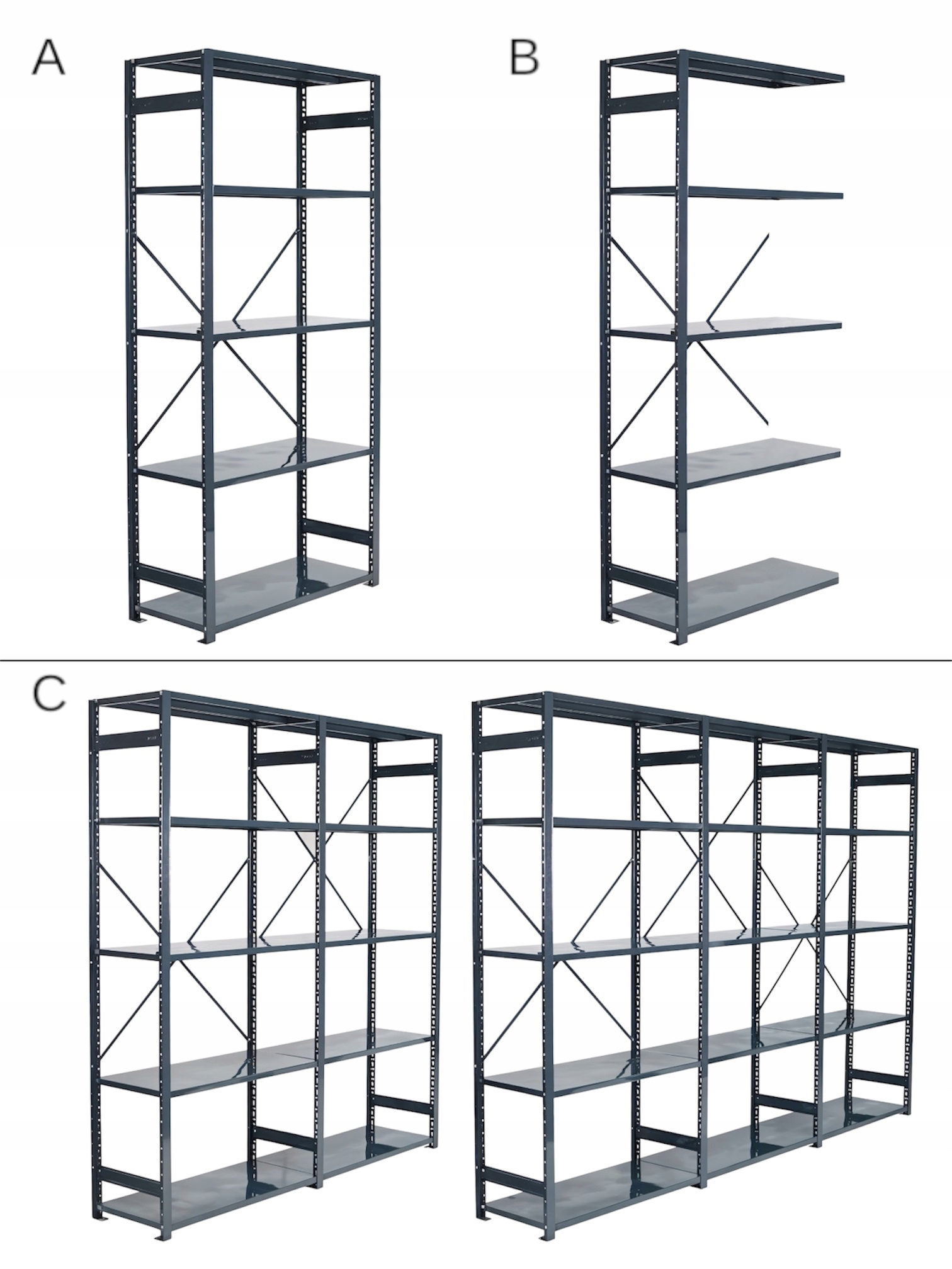 A.- Segment startowy/ wolnostojący- możesz wykorzystać go jako samodzielny regał wolnostojący lub ustawić go jako pierwszy w ciągu i do niego dobudowywać dowolną ilość segmentów dodatkowych tworząc ciągi regałów.