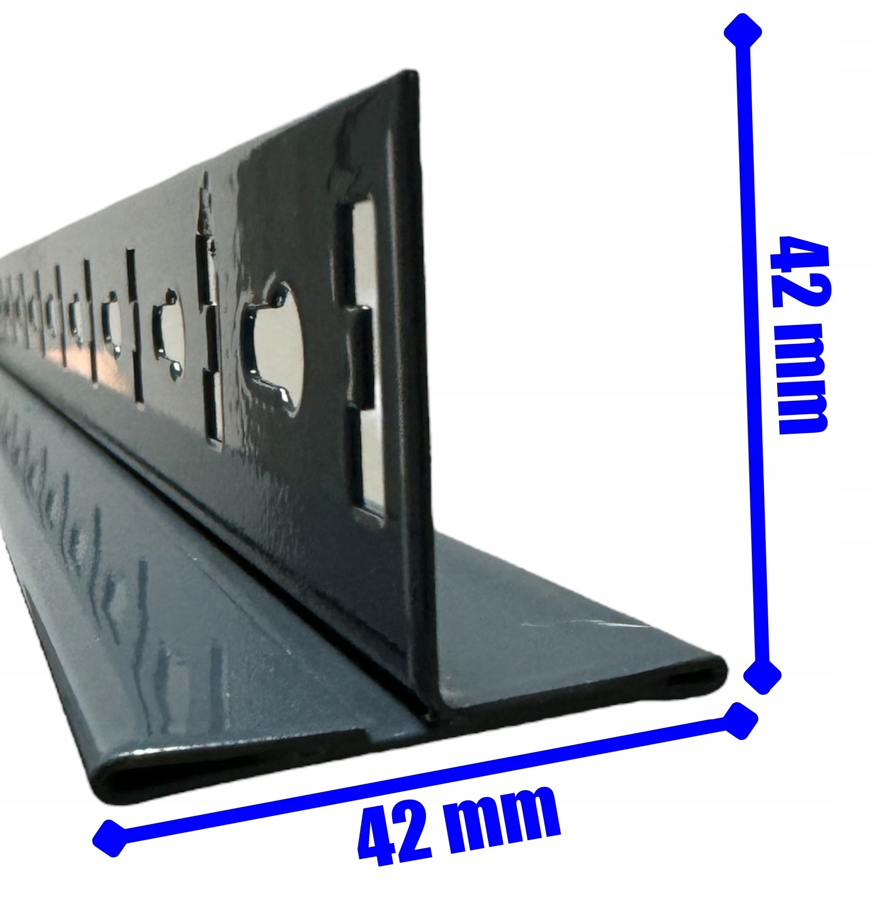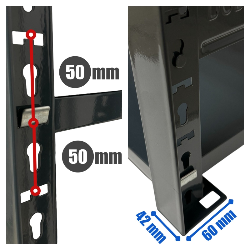 Perforacja profili wykonana na maszynach numerycznych z bardzo dużą dokładnością umożliwią regulację rozstawu półek co 50 mm góra-dół. W połączeniu z haczykami mocującymi w bardzo szybki sposób w dowolnej chwili możesz zmienić układ półek w swoim regale.