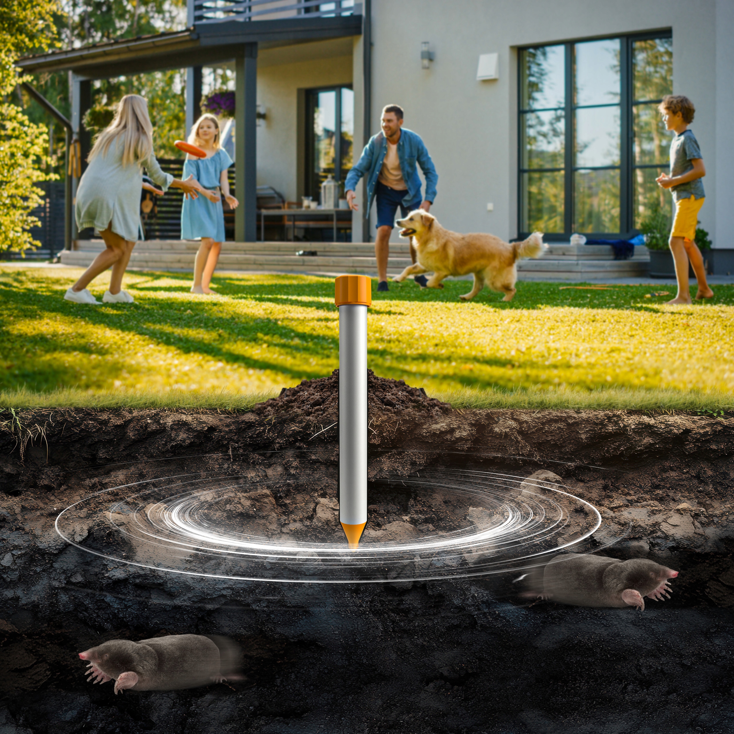 Odstraszacz kretów działa 24/7. Urządzenie przeciw kretom i nornicom jest w stanie zabezpieczyć około 1500 m² powierzchni. Dzięki szerokiemu zasięgowi jest to idealne rozwiązanie dla dużych ogrodów, działek czy trawników.