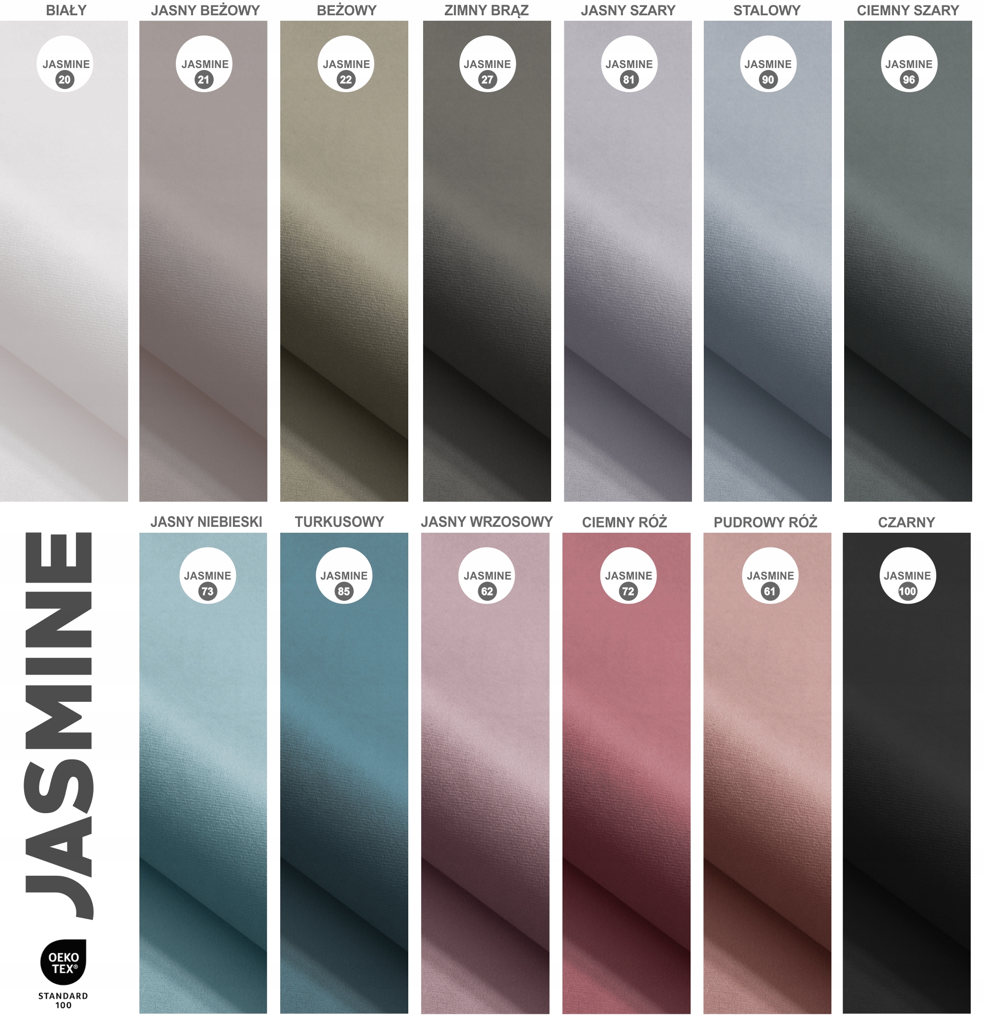 Jasmine to gładka tkanina welurowa o jednolitych barwach. Przyjemna w dotyku, cieniująca się.
