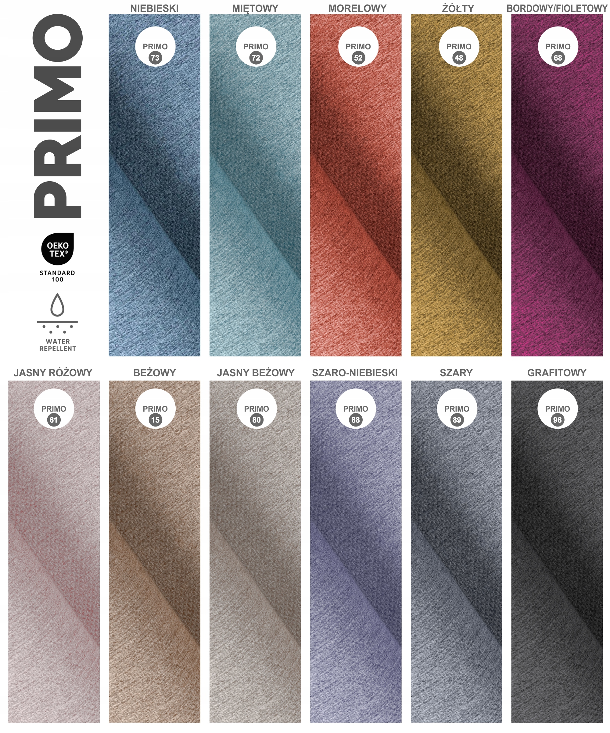 Primo to delikatna w dotyku tkanina tapicerska o właściwościach utrudniających wchłanianie się płynów, co znacznie ułatwia utrzymanie czystości. Posiada widoczny splot.