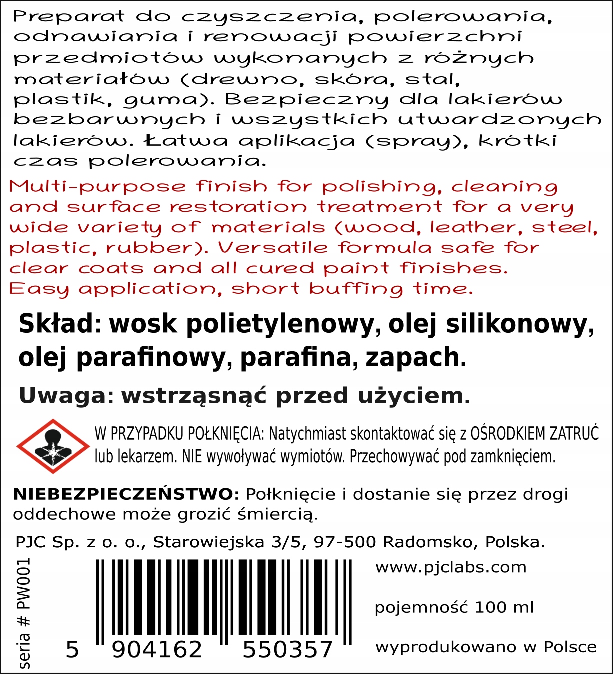 Uniwersalny środek do szybkiego czyszczenia, polerowania i odnawiania drewnianych mebli, skóry naturalnej i renowacji powierzchni przedmiotów wykonanych z różnych materiałów (drewno, skóra, stal, plastik, guma). Uniwersalna formuła, bezpieczna dla lakierów bezbarwnych i wszystkich utwardzonych lakierów. Łatwa aplikacja (spray), krótki czas polerowania.