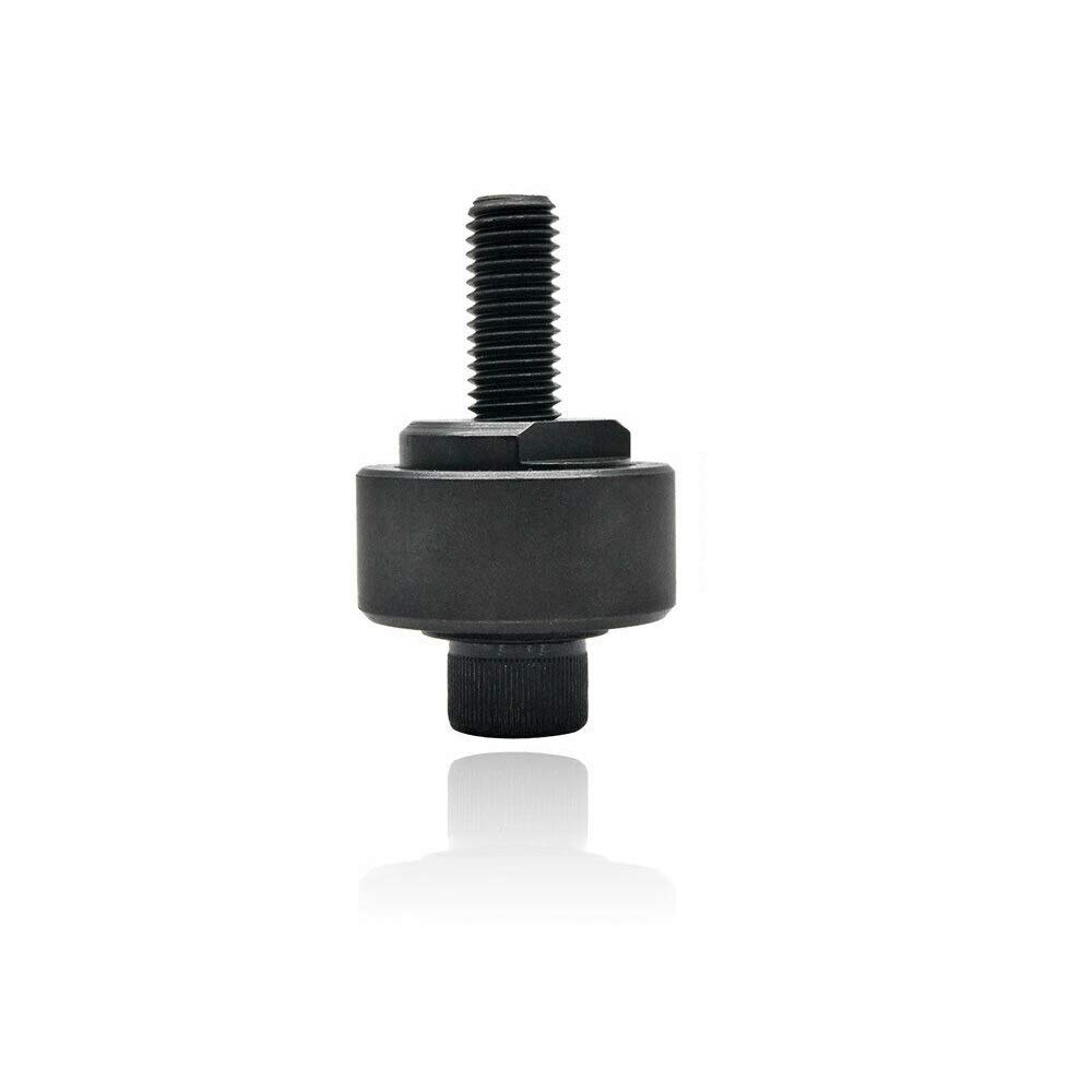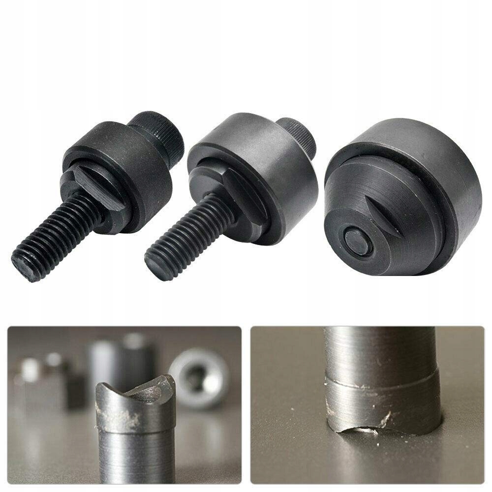 Umieść matrycę na nakrętce matrycy, a następnie nakręć nakrętkę matrycy na wystającą śrubę sześciokątną, aż dotknie blachy. Za pomocą klucza imbusowego odkręć śrubę sześciokątną. Śruba przeciągnie dziurkacz przez metal, w wyniku czego powstanie otwór.