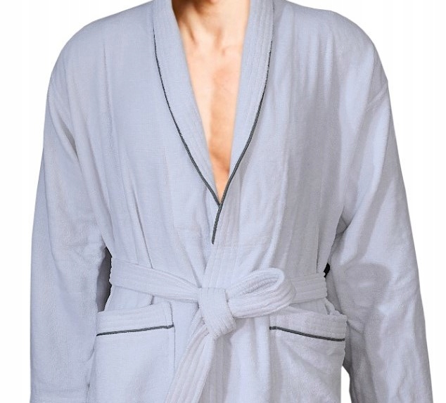 Szlafrok jest dostępny w kolorze białym w szary pasek.