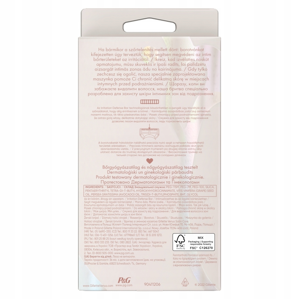 Specjalnie zaprojektowany, aby pomóc chronić skórę łonową przed podrażnieniami po goleniu. Ostrza maszynki do golenia Venus do stery intymnej mają zaawansowaną kostkę Irritation Defense i optymalnie rozmieszczone ostrza, które pozwalają ostrzom ścinać włosy, ledwo dotykając skóry. Ponadto wkłady do maszynki do golenia są wyposażone w precyzyjny trymer z tyłu ostrzy, który pomaga w trudno dostępnych miejscach.