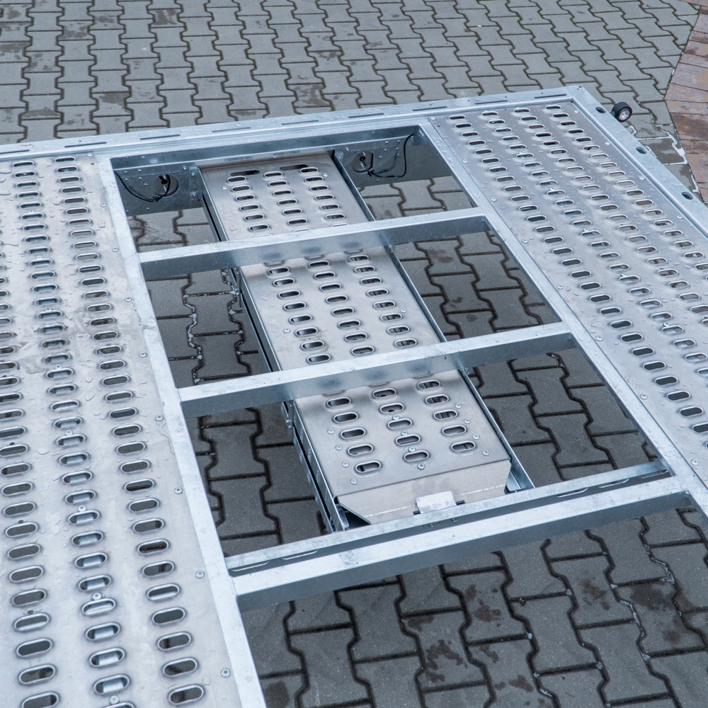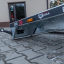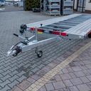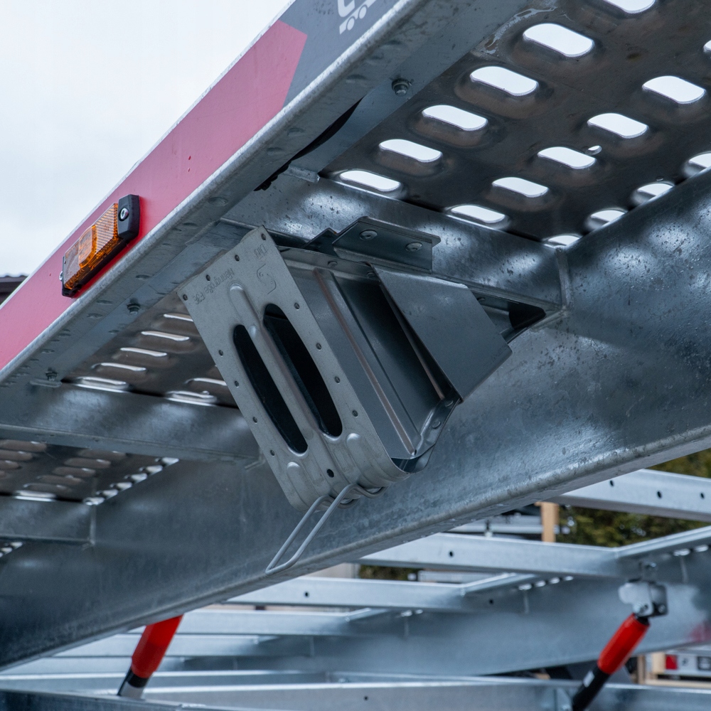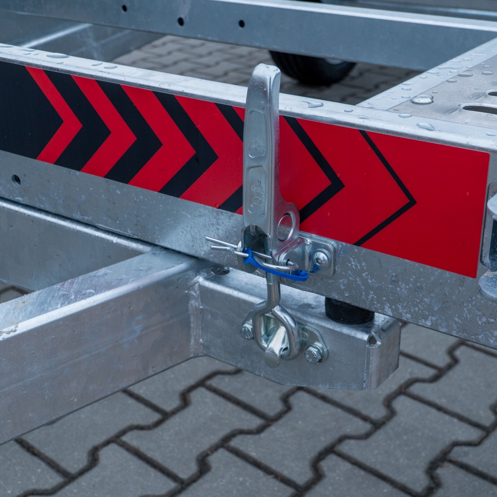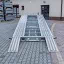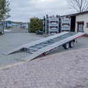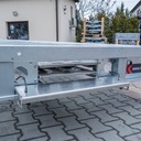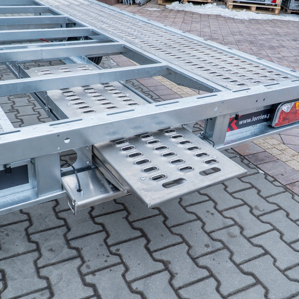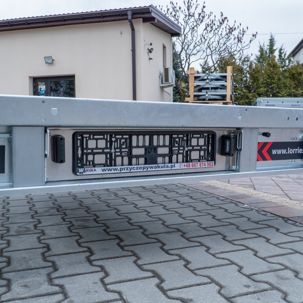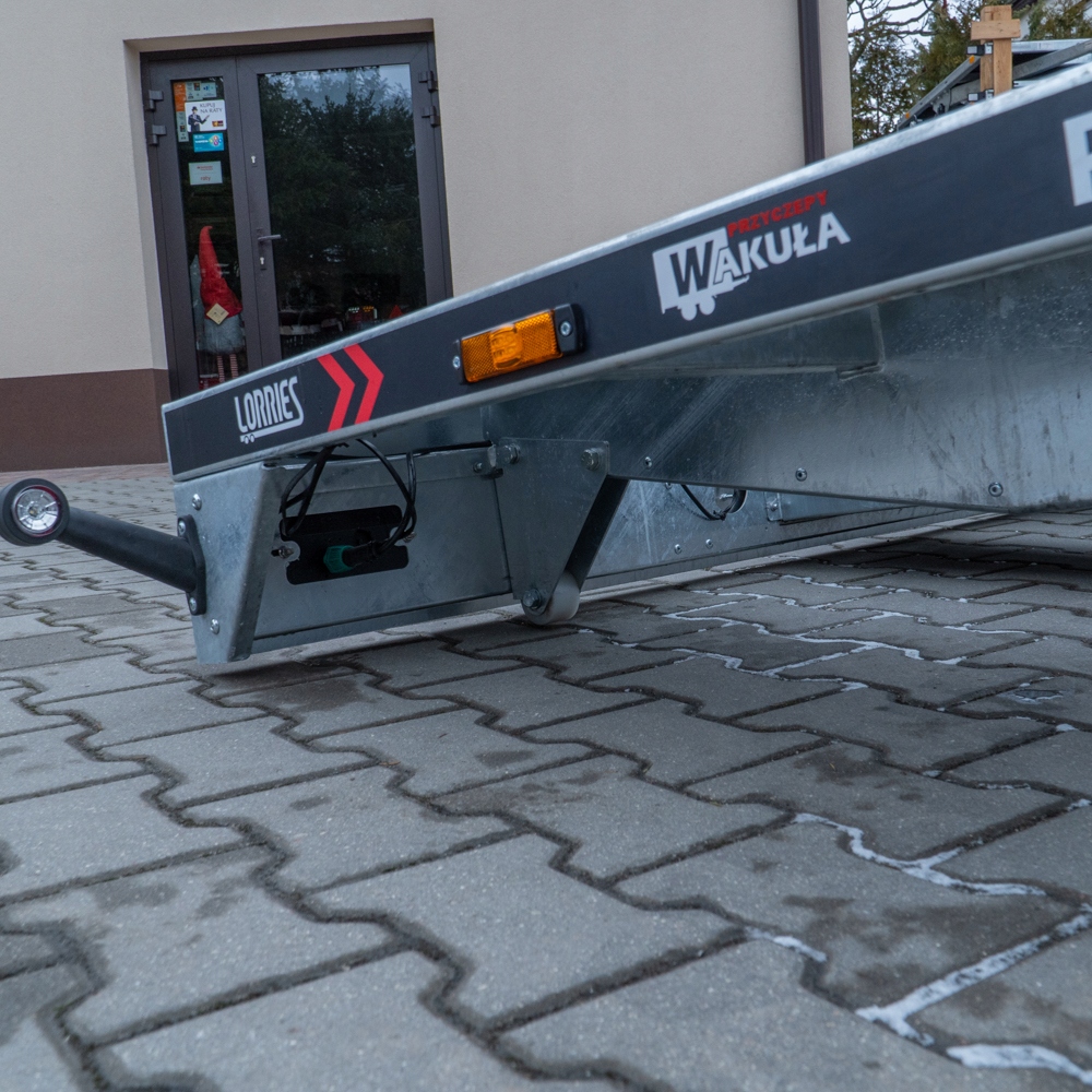 z zabezpieczeniem do zamykania podczas jazdy oraz trapy najazdowe z blachy perforowanej i tłoczonej typu „LOHR”. Najazdy wykonane są z aluminium, co gwarantuje ich trwałość, a jednocześnie nie obciąża nadmiernie całego pojazdu. Dzięki spawaniu posiada wytrzymały korpus i ramę. Jej konstrukcja zabezpieczona jest przed korozją poprzez cynkowanie ogniowe. Rampa uchylna i dyszel przyczepy wykonane zostały z profili zamkniętych, co nadaje sztywność i stabilność całej przyczepie oraz gwarantuje długą żywotność i bezawaryjną eksploatację. Rampa uchylna wyposażona jest w amortyzatory, które ułatwiają załadunek i rozładunek pojazdu. Opcjonalnie można wyposażyć lawetę