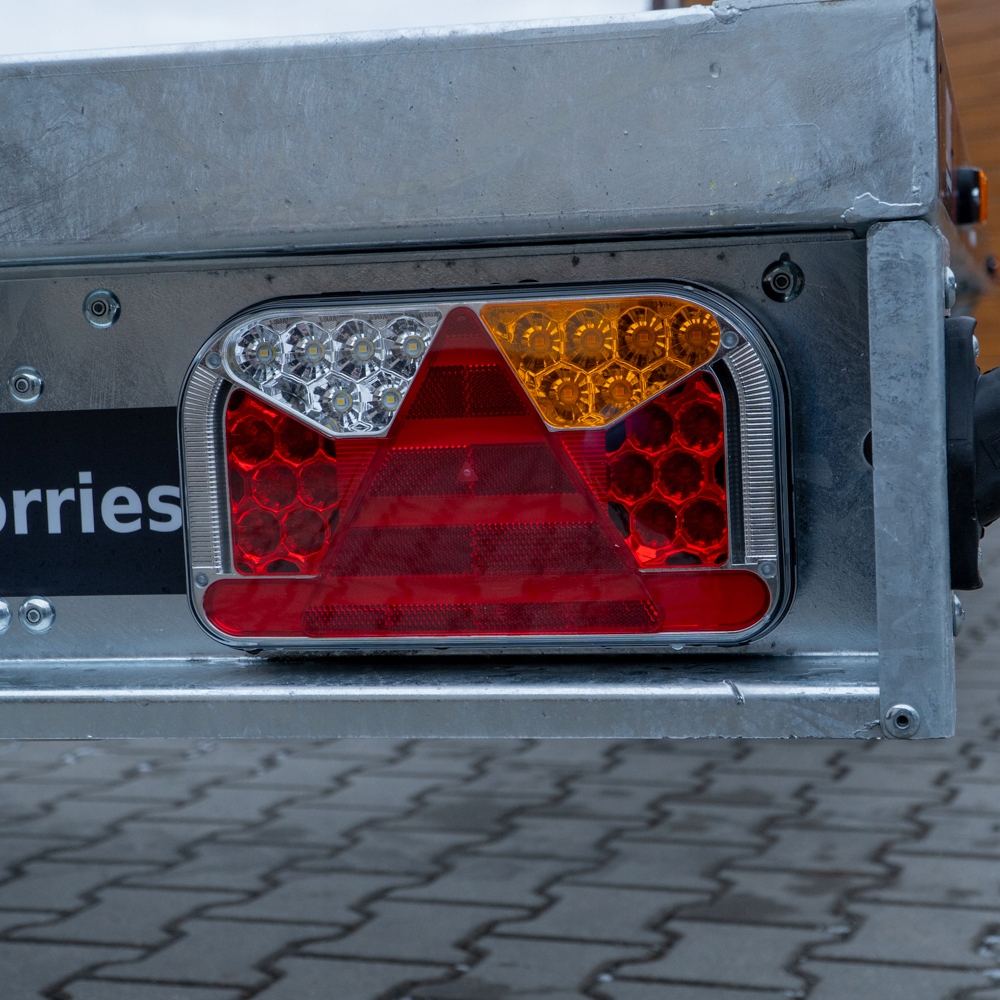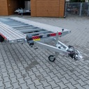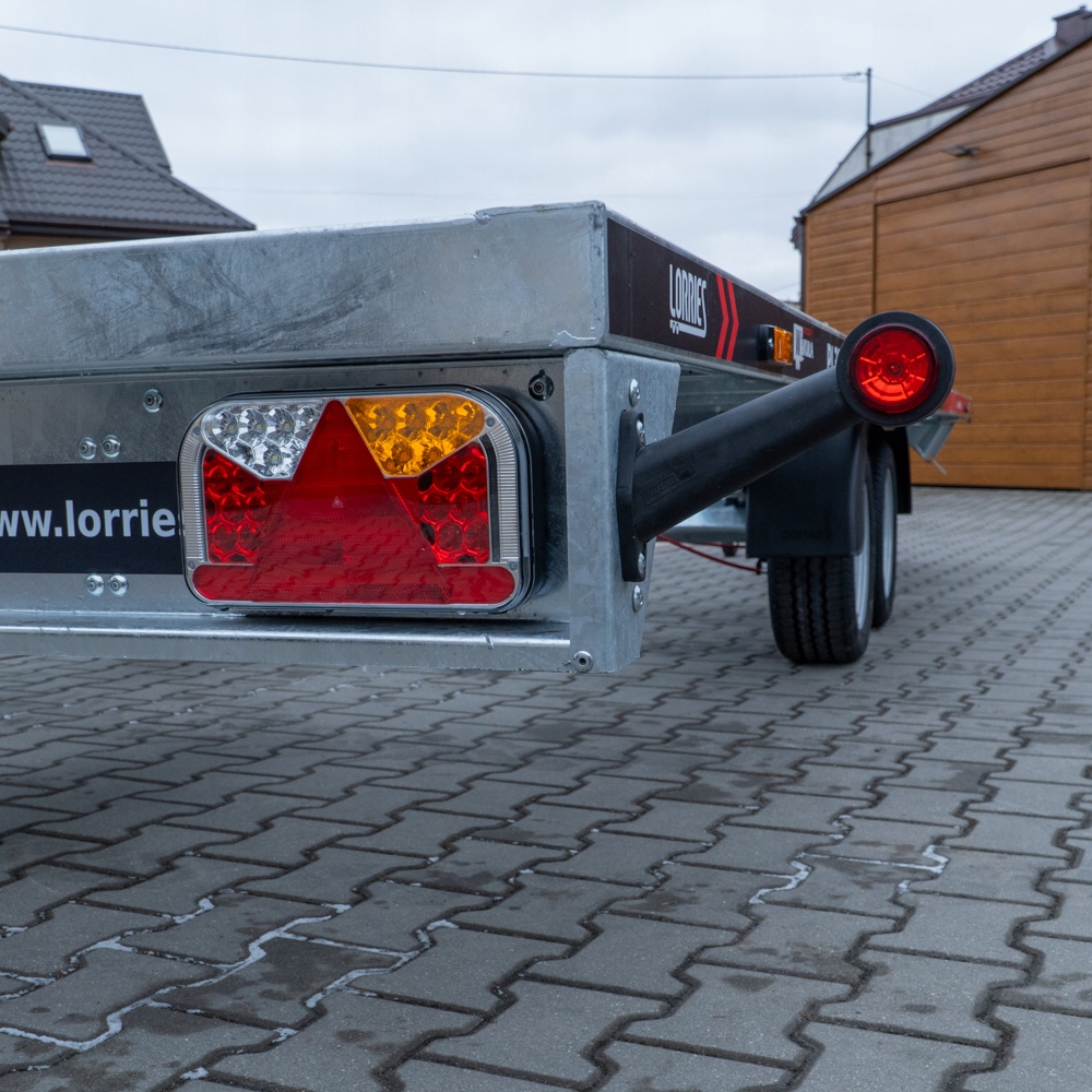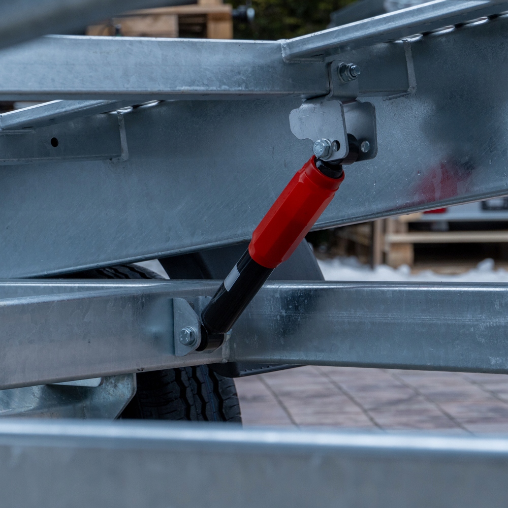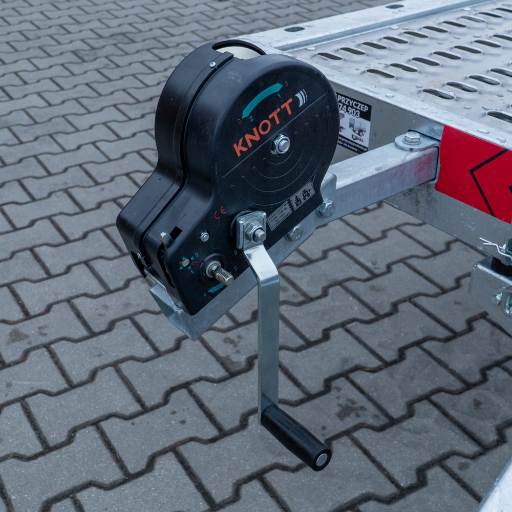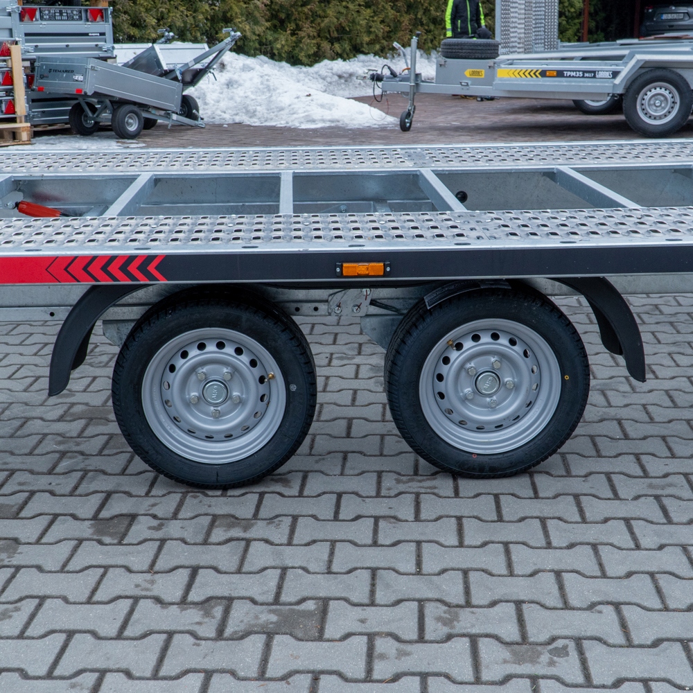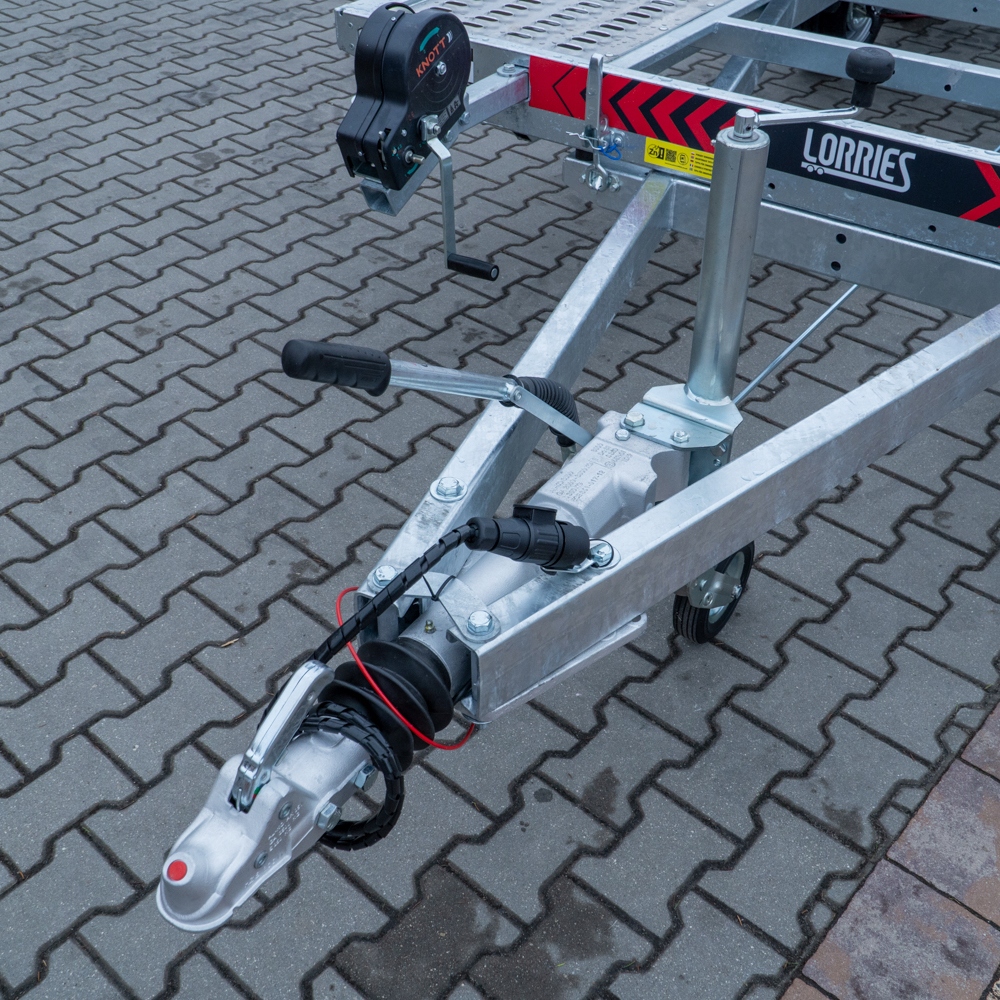 z zabezpieczeniem do zamykania podczas jazdy oraz trapy najazdowe z blachy perforowanej i tłoczonej typu „LOHR”. Najazdy wykonane są z aluminium, co gwarantuje ich trwałość, a jednocześnie nie obciąża nadmiernie całego pojazdu. Dzięki spawaniu posiada wytrzymały korpus i ramę. Jej konstrukcja zabezpieczona jest przed korozją poprzez cynkowanie ogniowe. Rampa uchylna i dyszel przyczepy wykonane zostały z profili zamkniętych, co nadaje sztywność i stabilność całej przyczepie oraz gwarantuje długą żywotność i bezawaryjną eksploatację. Rampa uchylna wyposażona jest w amortyzatory, które ułatwiają załadunek i rozładunek pojazdu. Opcjonalnie można wyposażyć lawetę