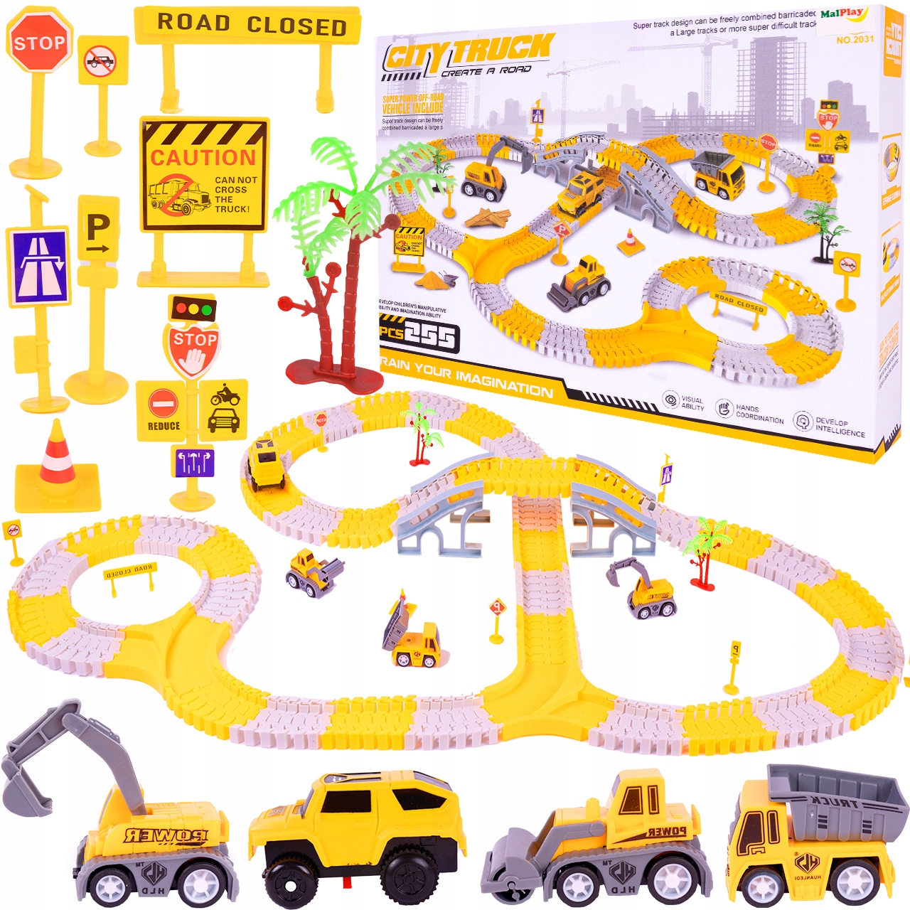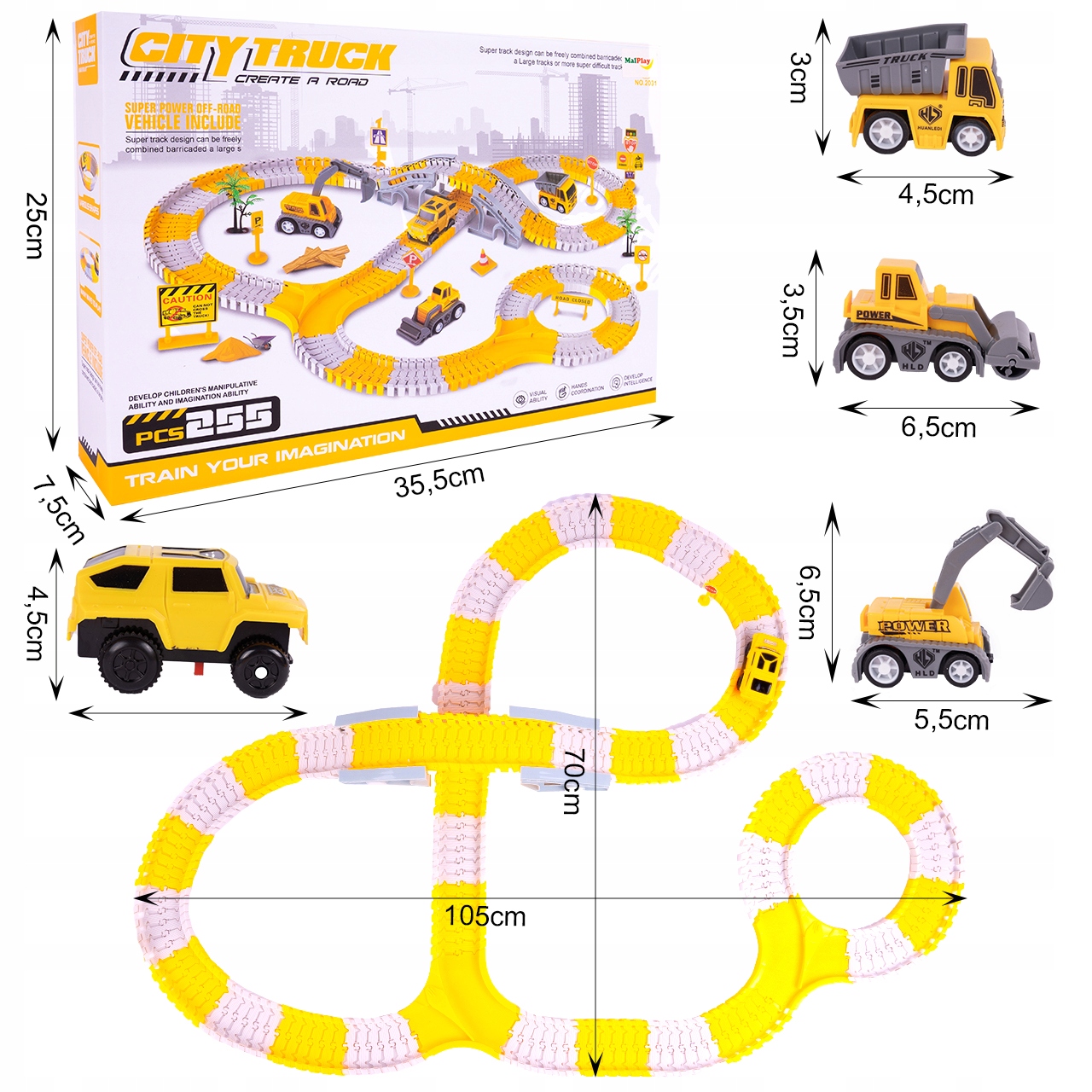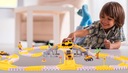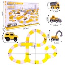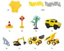 Zestaw oprócz głównego autka zasilanego, który porusza się bezpośrednio po torze wyposażony został w trzy resoraki. Każdy pojazd z kolekcji jest wyjątkowy. Jak na placu budowy tak i w naszym zestawie nie zabrakło koparki, wywrotki i walca. Resoraki posiadają ręczny napęd, który sprawi, że puszczone w ruch nie zatrzymają się szybko. Oto cała kolekcja - zaproś więc przyjaciół i bawcie się w najlepsze z tymi niepowtarzalnymi pojazdami.