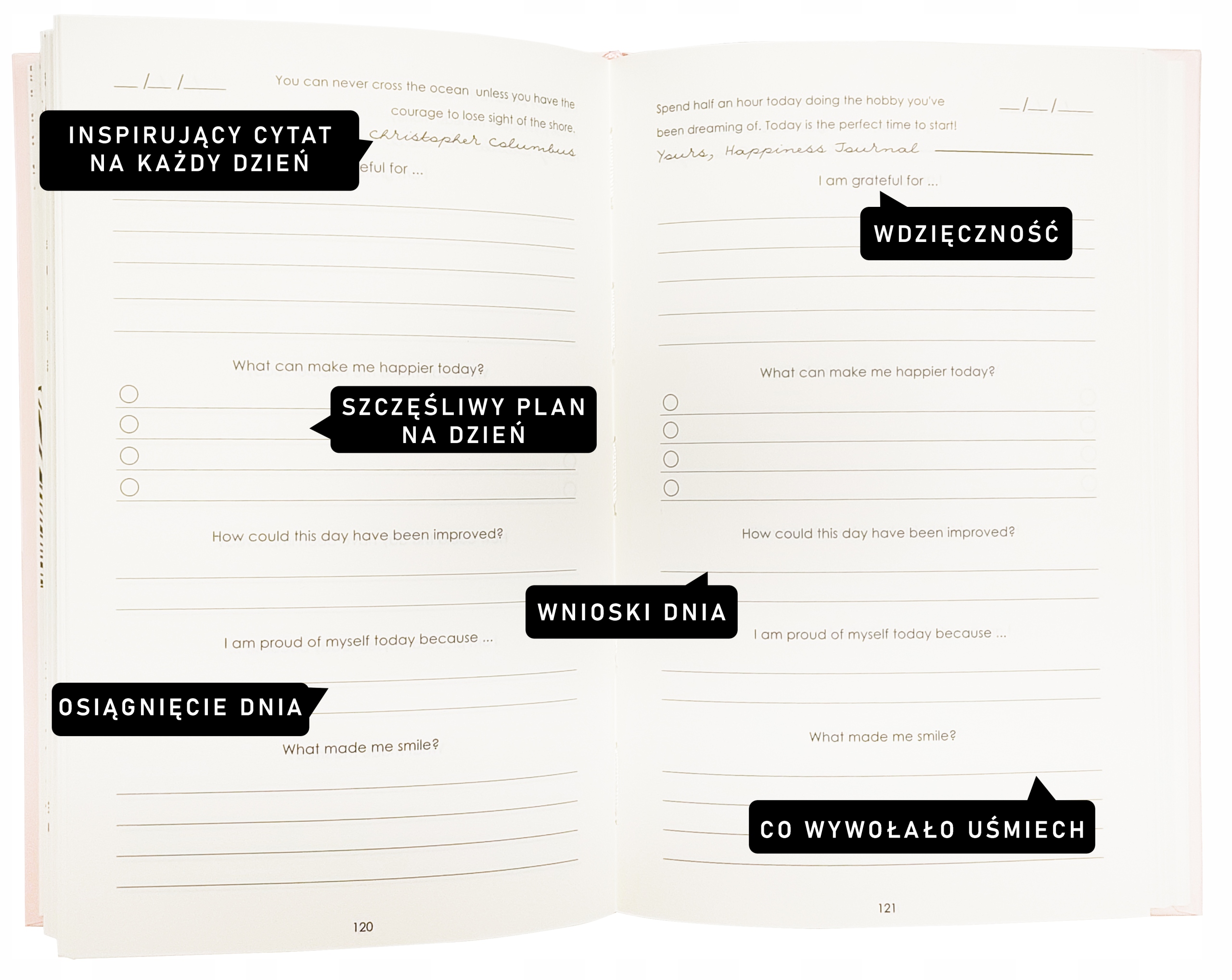 Dziennik Happiness Journal to wyjątkowy, pięknie zaprojektowany pamiętnik wydany w języku angielskim, który stanie się Twoim osobistym przewodnikiem po szczęściu, wdzięczności i lepszej wersji samej siebie. Idealny do codziennego celebrowania małych chwil, które tworzą pełnię życia.