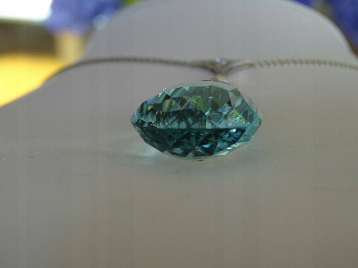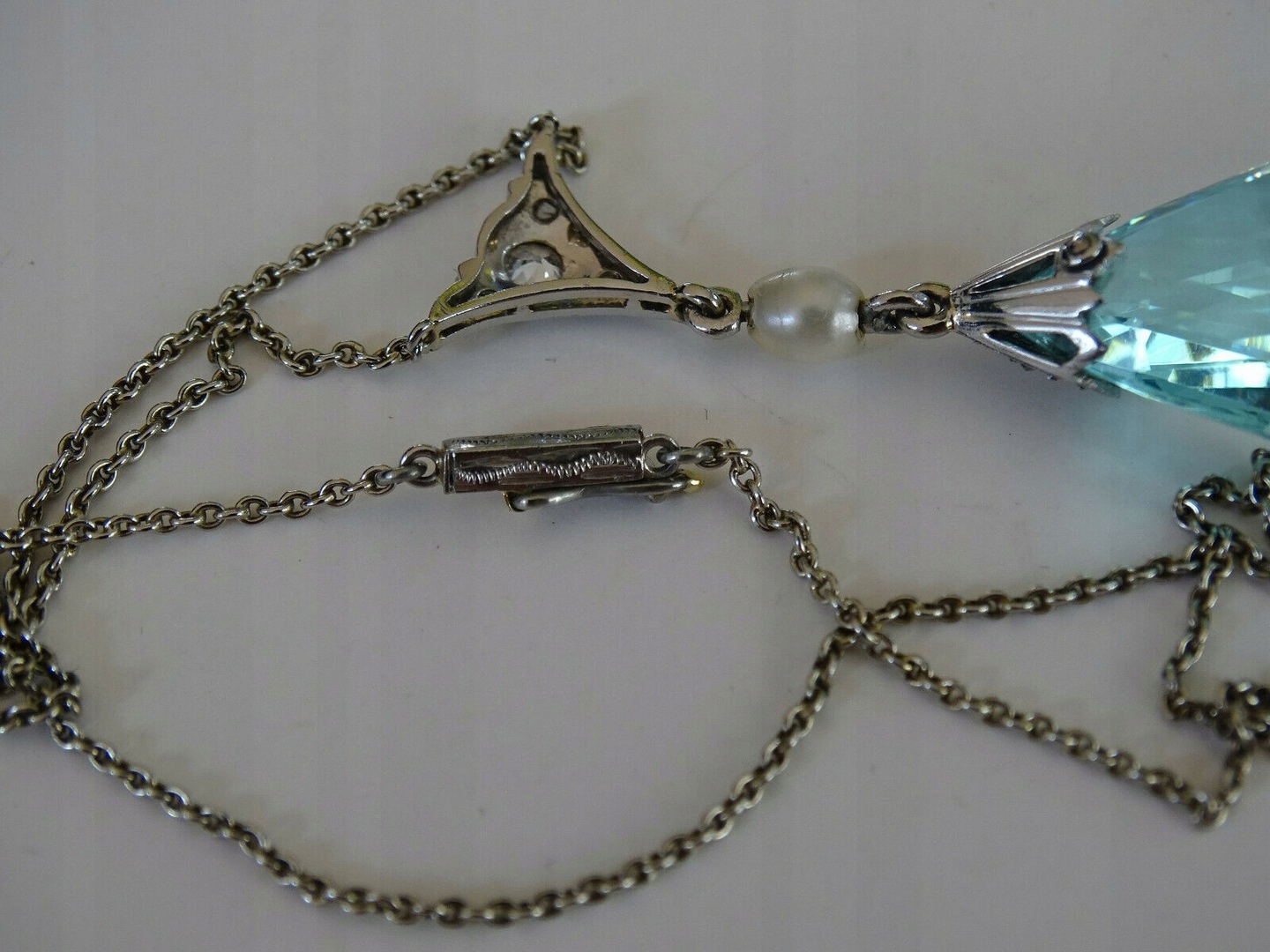 Unikatowy Naszyjnik wykonany w Platynie. Zdobienie ; Akwamaryn Naturalny - unikatowy ze wzgledu na swoje parametry, doskonalej jakosci w szlifie fasetowej lezki na formie brioletty - okreslanego jako podwojny szlif rozany. Wymiary Akwamaryny 4 x 2 cm , grubosc max. 1,2 cm - masa 59 karatow. Brylant o masie 0,10 karata . Czystosc SI Barwa W - Wesselton - Biel, oraz 9 w szlifach nieregularnych o masie ca. 0,10 karata. Perla o srednicy 4 mm. Wymiary naszyjnika ; czesc ozdobna o dlugosci 6 cm, dlugosc lancuszka 45 cm. Waga 16,91 grama. Naszyjnik posiada Certyfikat. Stan jak na zdjeciach.