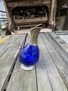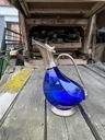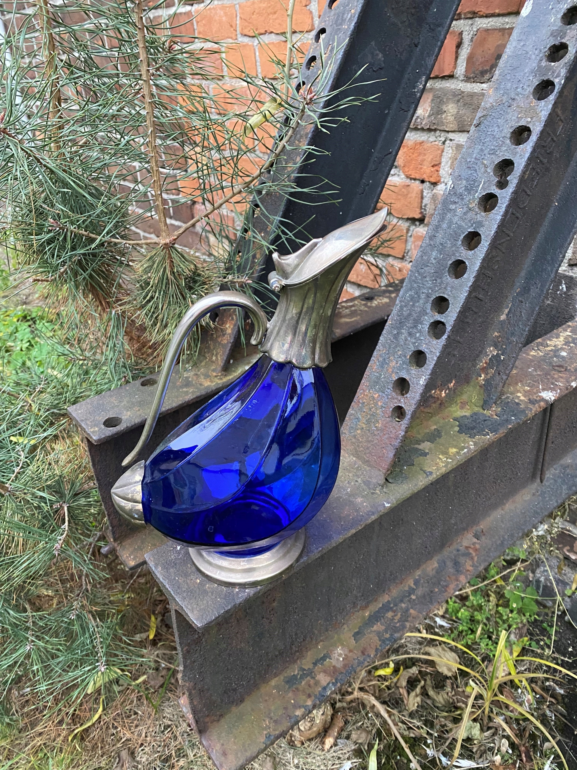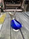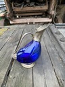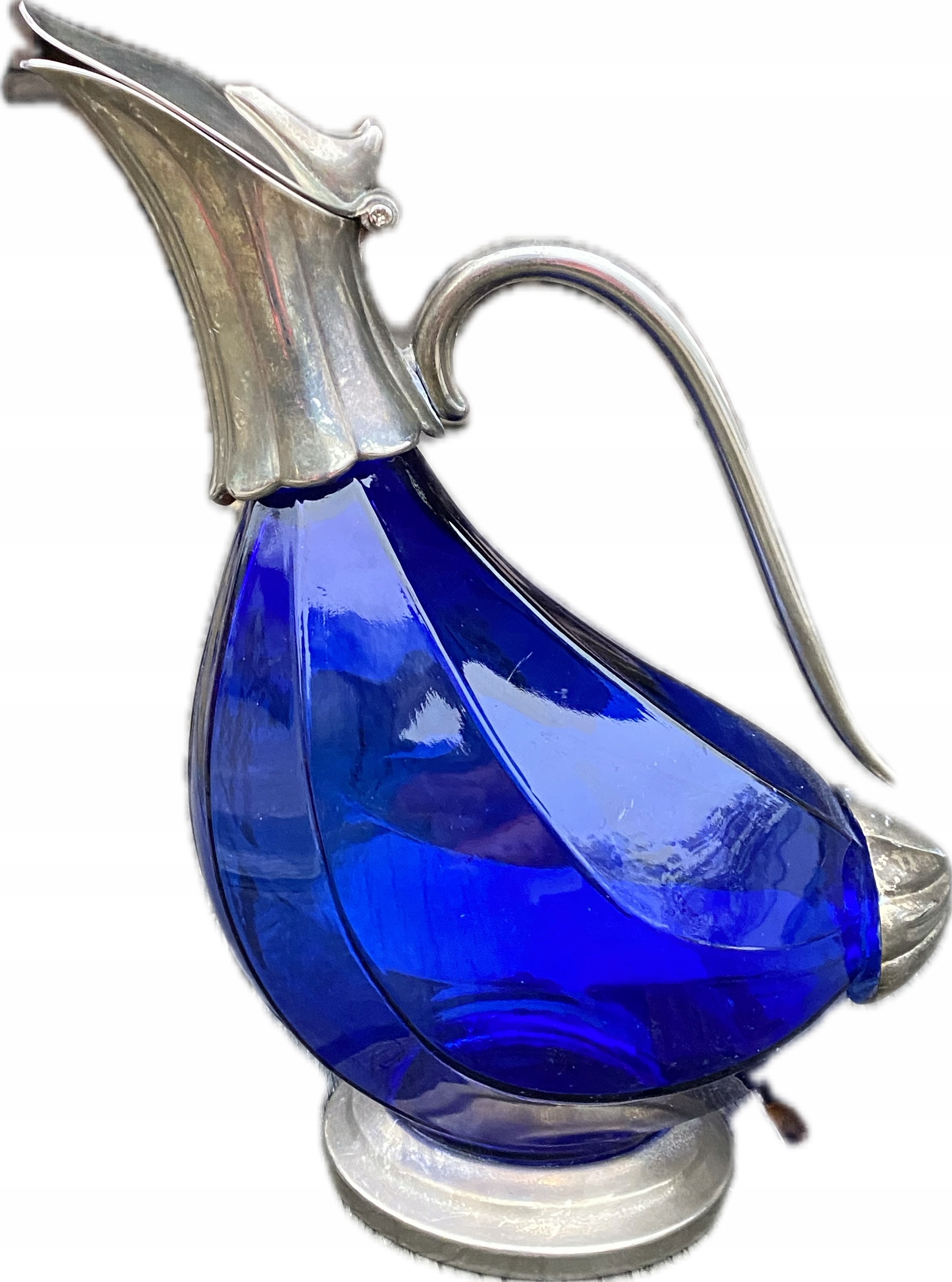 Dzban wykonany ze szkła kobaltowego okuty w platerowany metal. Wymiary; wys.26 x 20 x 10 cm. Polecam