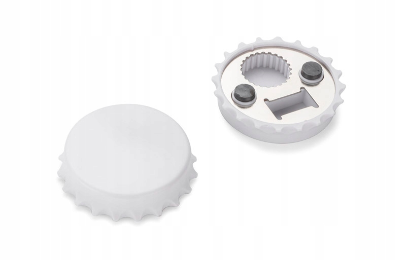 Otwieracz do butelek w kształcie kapsla. Posiada wbudowany magnes, za pomocą którego otwieracz można przymocować do lodówki.