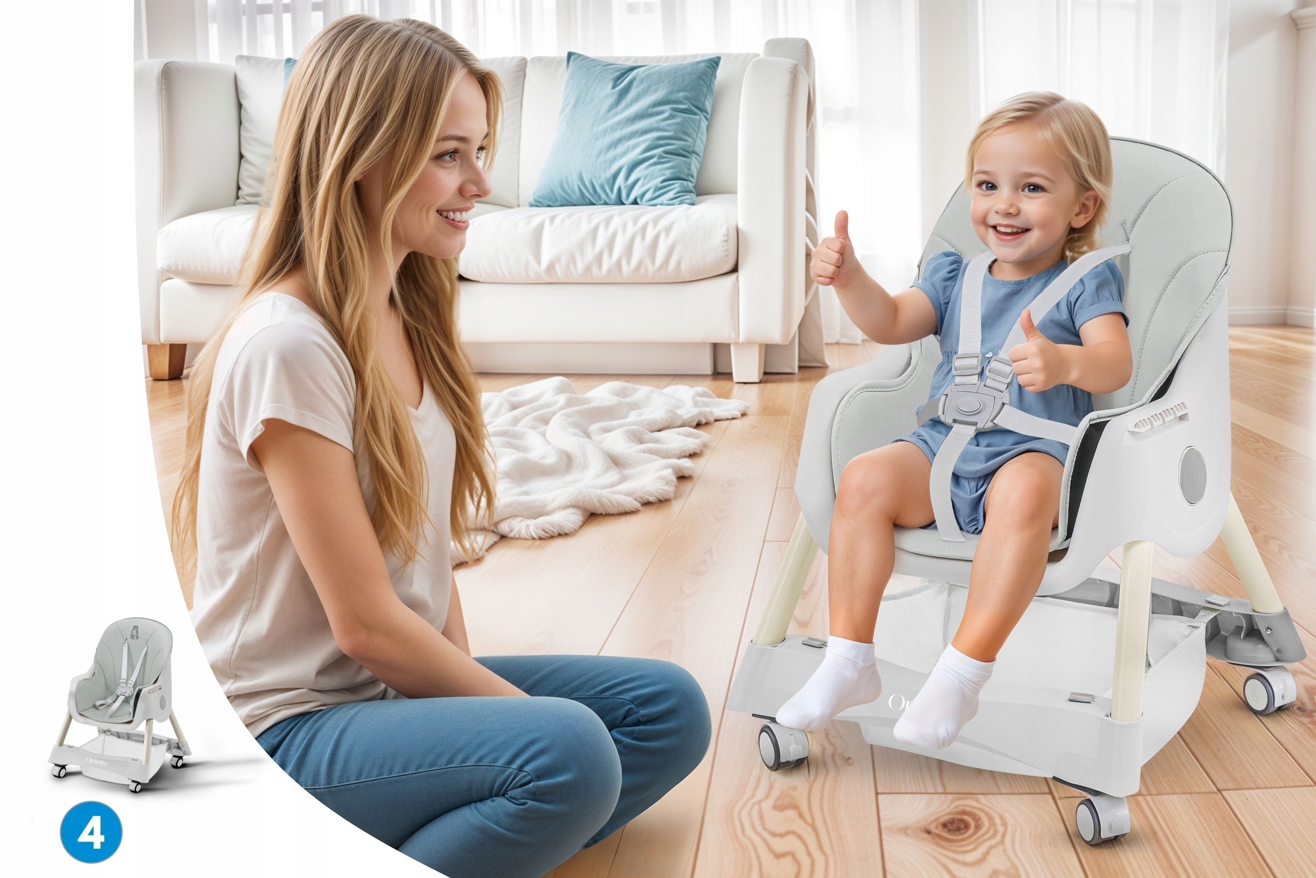 ✅ Obie tacki można również całkowicie zdjąć, co umożliwia dosunięcie krzesełka bezpośrednio do blatu stołu, aby dziecko mogło spożywać posiłki razem z rodzicami.