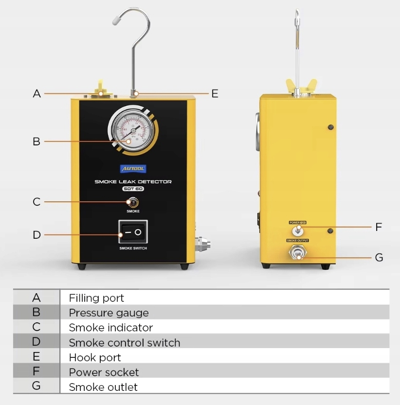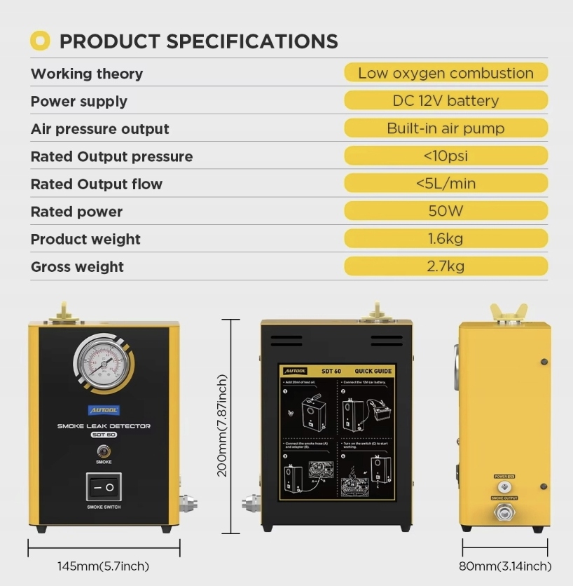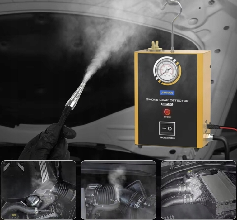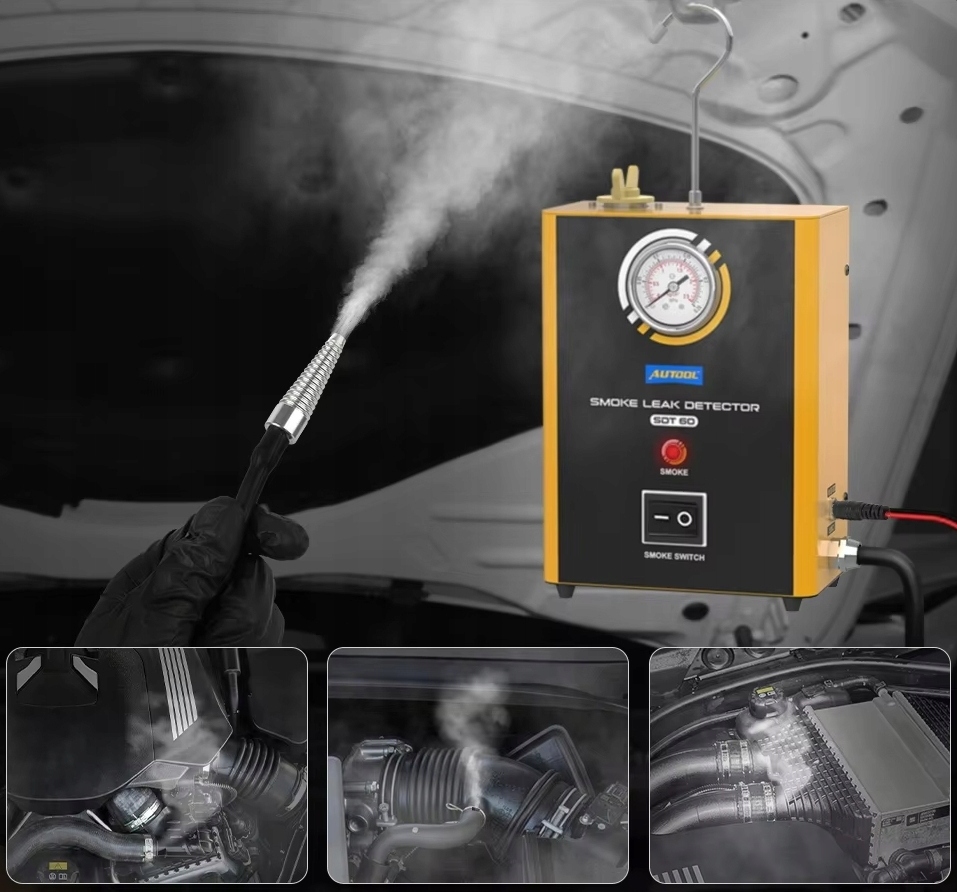 Profesjonalny automatyczny tester szczelności rur, węży, złączy, instalacji przy użyciu generatora dymu. Pomoże nam to w szybkim i dokładnym zlokalizowaniu wycieków w układach rurowych w ciągu kilku minut. Możliwość wykorzystania urządzenia przy testach układu dolotowego, test turbosprężarki, test układu wydechowego, test układu chłodzenia, test uszczelnienia samochodu, test układu zbiornika paliwa, test różnych złączek rurowych.