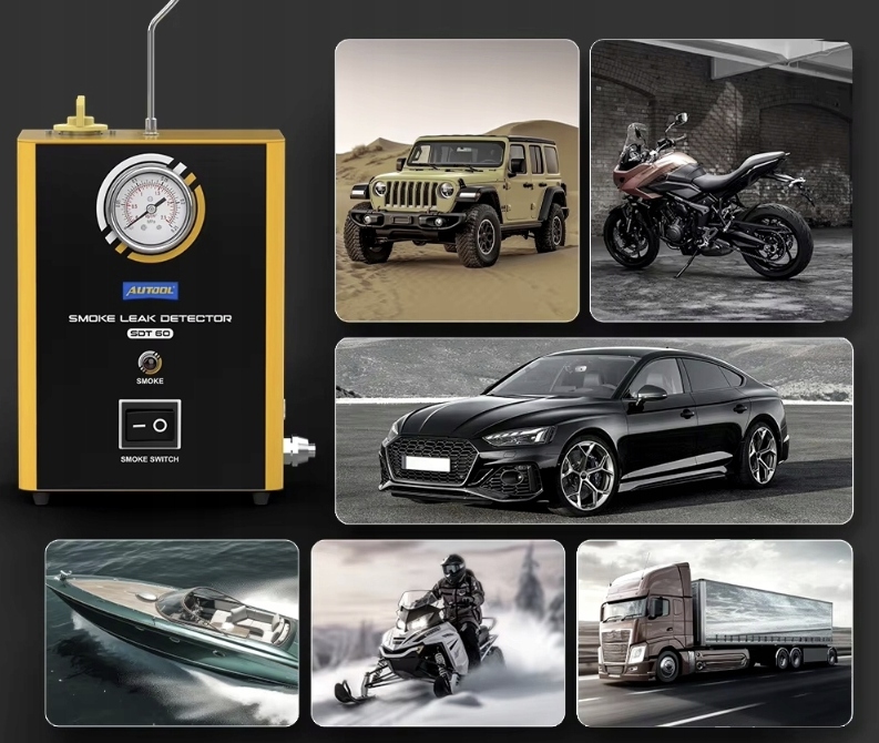 Profesjonalny automatyczny tester szczelności rur, węży, złączy, instalacji przy użyciu generatora dymu. Pomoże nam to w szybkim i dokładnym zlokalizowaniu wycieków w układach rurowych w ciągu kilku minut. Możliwość wykorzystania urządzenia przy testach układu dolotowego, test układu wydechowego, test układu chłodzenia, test uszczelnienia samochodu, test układu zbiornika paliwa, test różnych złączek rurowych.