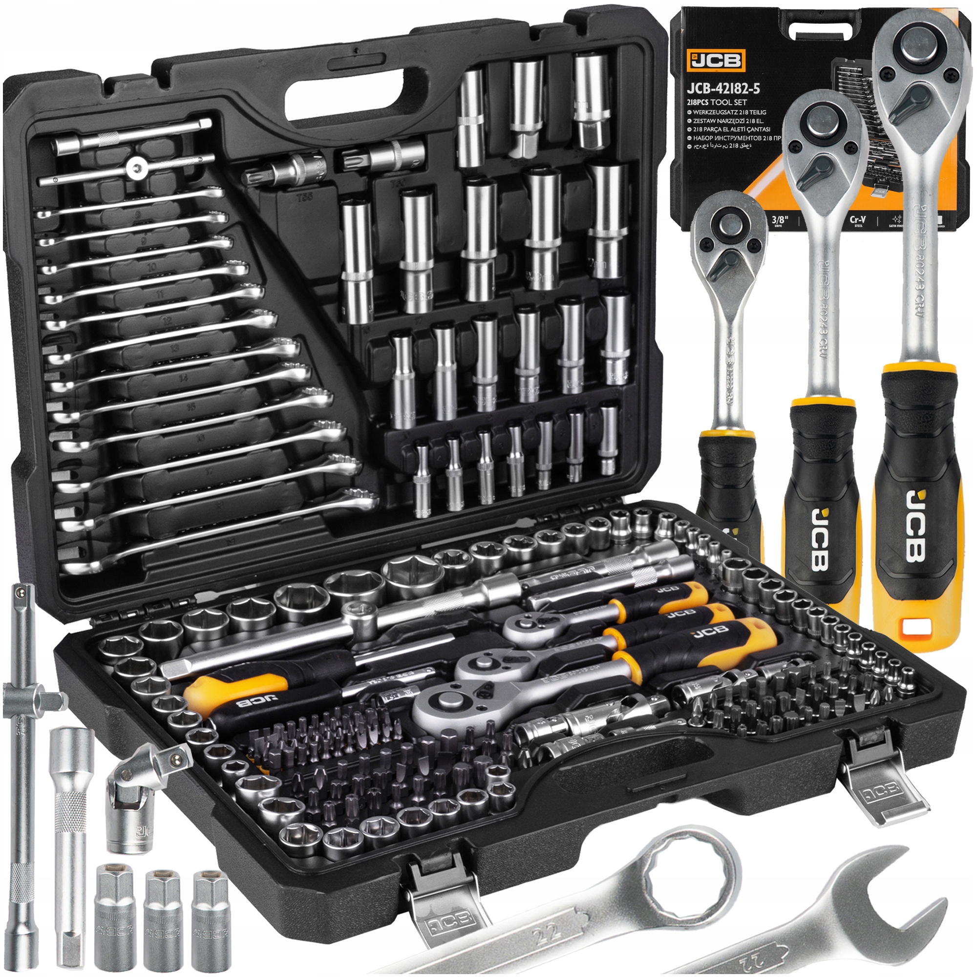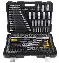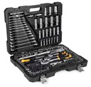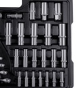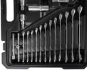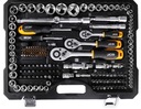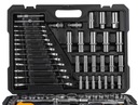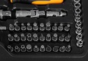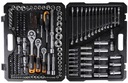 Zestaw zawiera bogaty wybór kluczy nasadowych, grzechotek, bitów, kluczy trzpieniowych oraz akcesoriów, takich jak przedłużki, przeguby, imbusy i uchwyty na bity