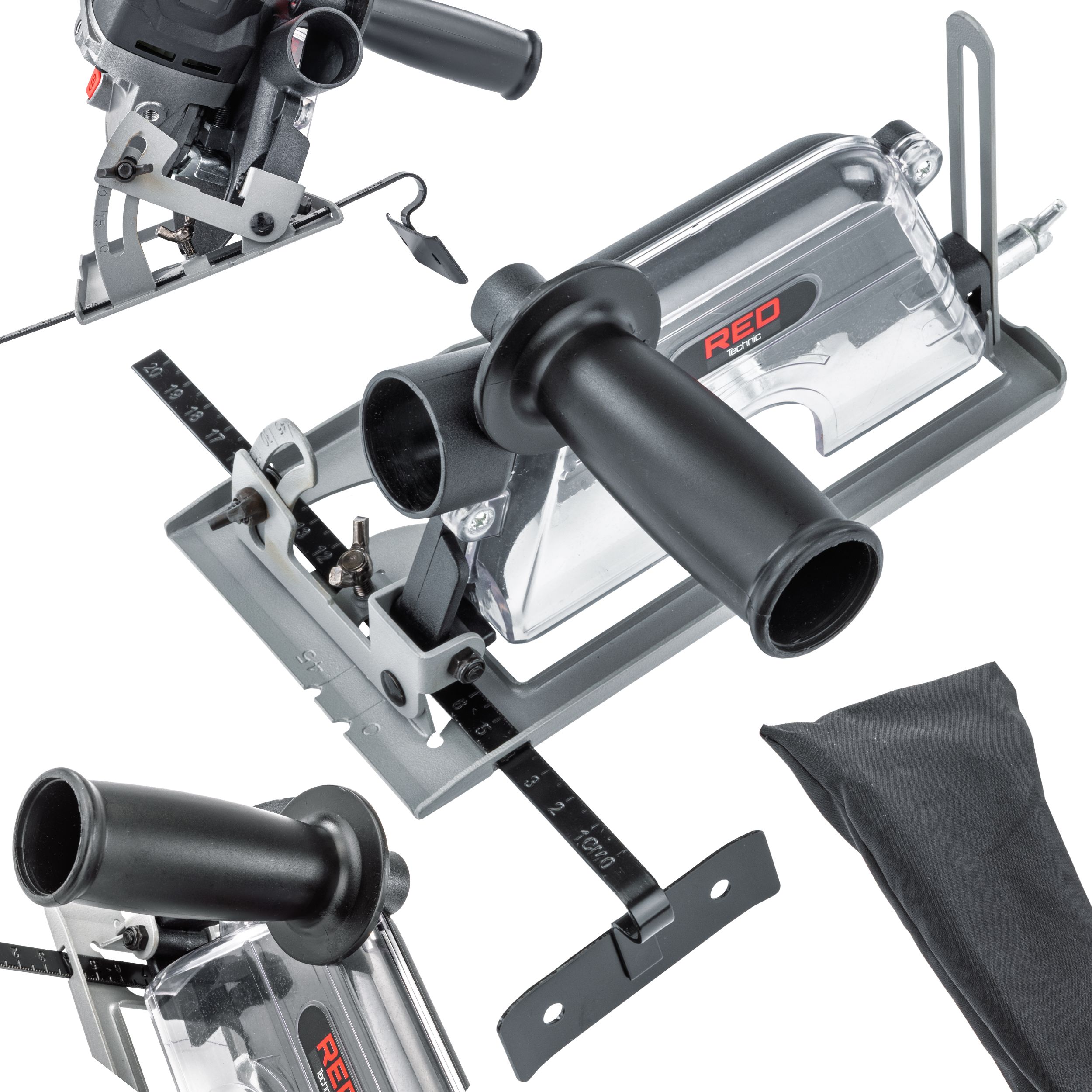 Dzięki możliwości ustawienia kąta cięcia od 0° do 45°, przystawka pozwala na precyzyjną i zróżnicowaną obróbkę materiałów. Wbudowana metalowa miarka dodatkowo ułatwia kontrolowanie odległości od krawędzi, co gwarantuje powtarzalność efektów.