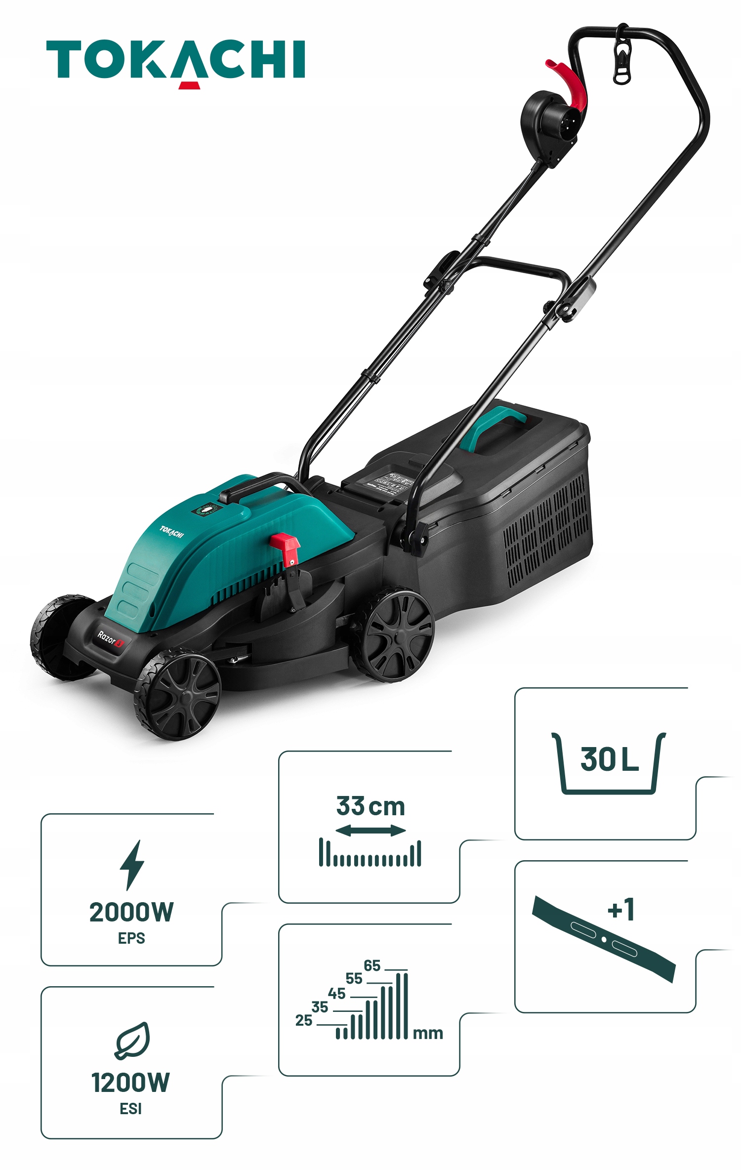 Kosiarka elektryczna | Bezawaryjny silnik indukcyjny | Szerokość koszenia aż 33cm | 2000W ESP | Pojemny kosz 30L | 5-stopniowa regulacja wysokości koszenia | Dwa noże w zestawie | Energooszczędna | Łatwy montaż