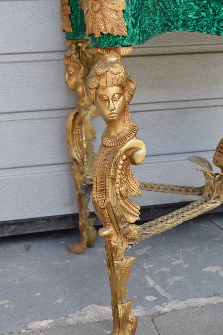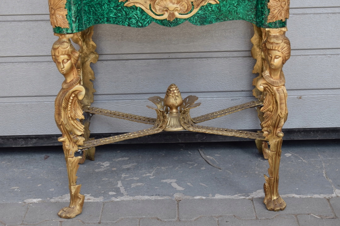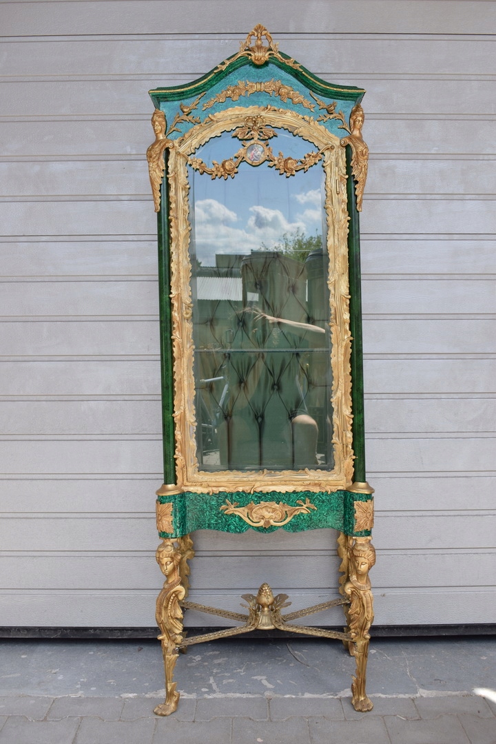 Представляем уникальный сайт в цвета малахита, украшенного бронзовой фурнитурой и фарфоровым медальоном. Эта элегантная витрина, также известный как сервант, это идеальный предмет мебели для демонстрации ценных предметов, которые в то же время он привносит в интерьер роскошь и стиль.