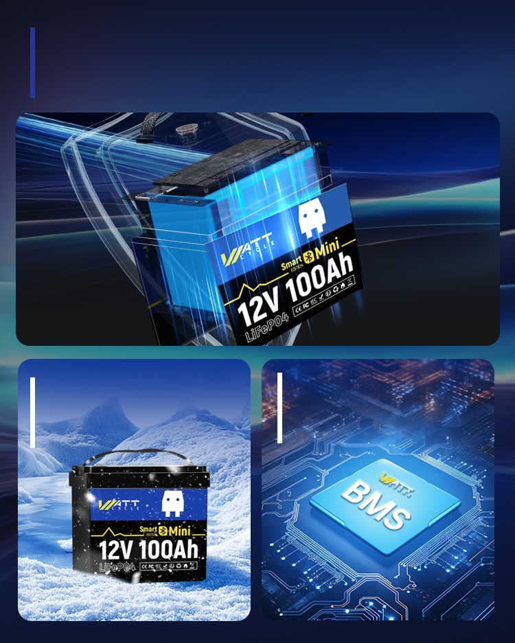 【 Rozmiar miniaturowy, maks. Moc 】: Akumulator WattCycle 12V 100Ah MINI Bluetooth LiFePO4 oferujący 11% zasilania wagowego i 39% potwierdzonego w świadomym działaniu stylu Group 24, podczas gdy jego energia elektryczna przekazywana jest do działań 195 Wh/L!