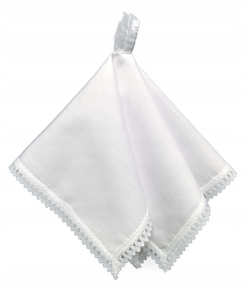 Biała chustka z elanobawełny, wykończona subtelną wąską koroneczką. Na środku posiada pętelkę ozdobną koronkową pętelkę (taka sama koronka jak na brzegu), dzięki czemu można założyć ją na palec.