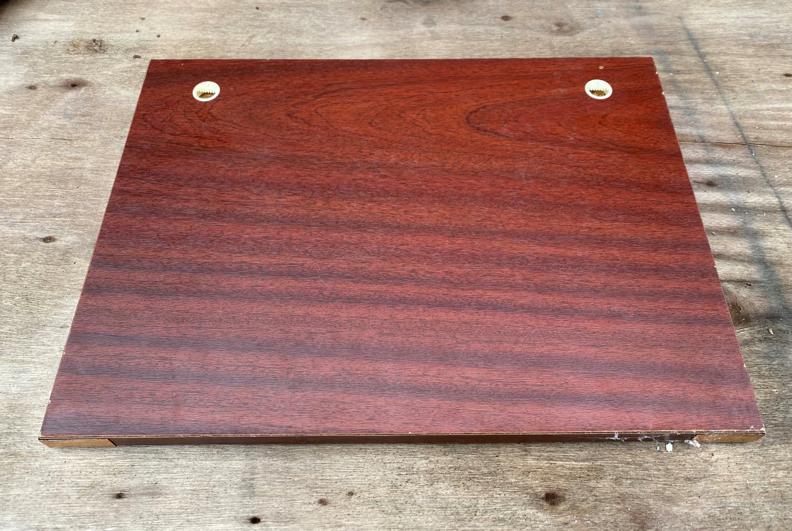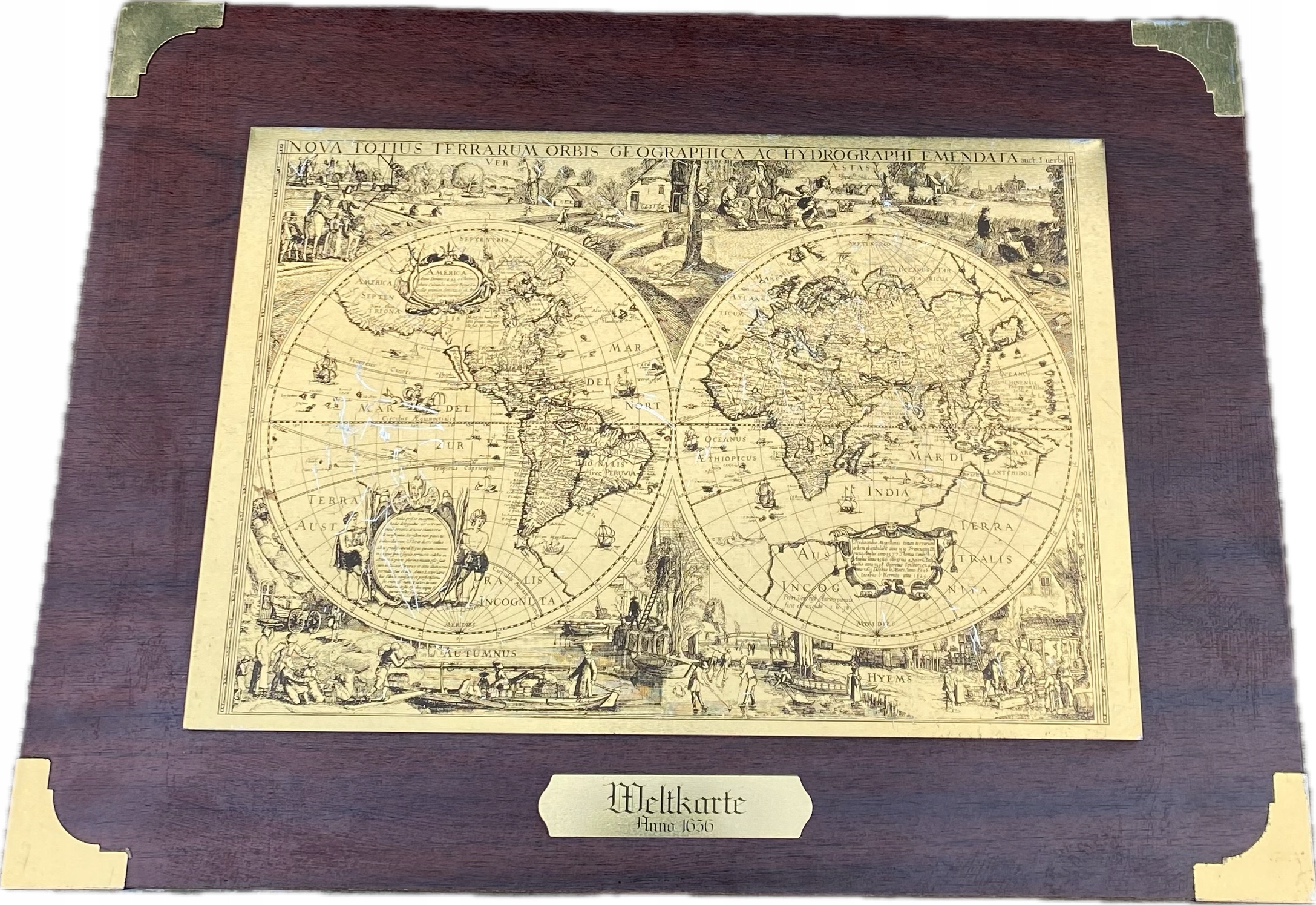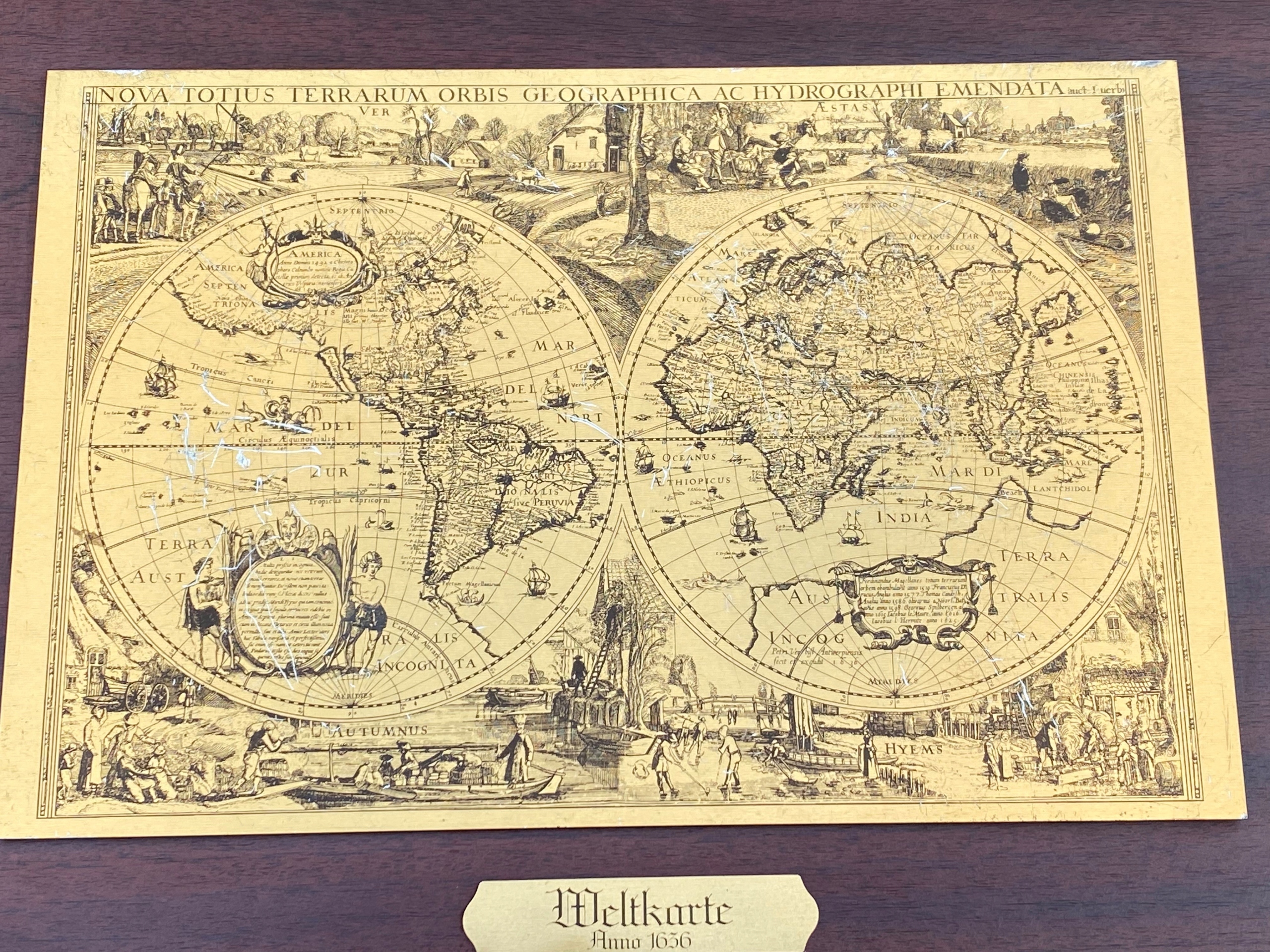 Mapa świata z 1656 roku przedstawiona na metalowej płytce wykonana metodą sitodruku osadzona na desce oklejoną mahoniem. Ślady użytkowania. Rysy i przetarcia nadruku. Wymiary; wys.39,5 x 40 cm.