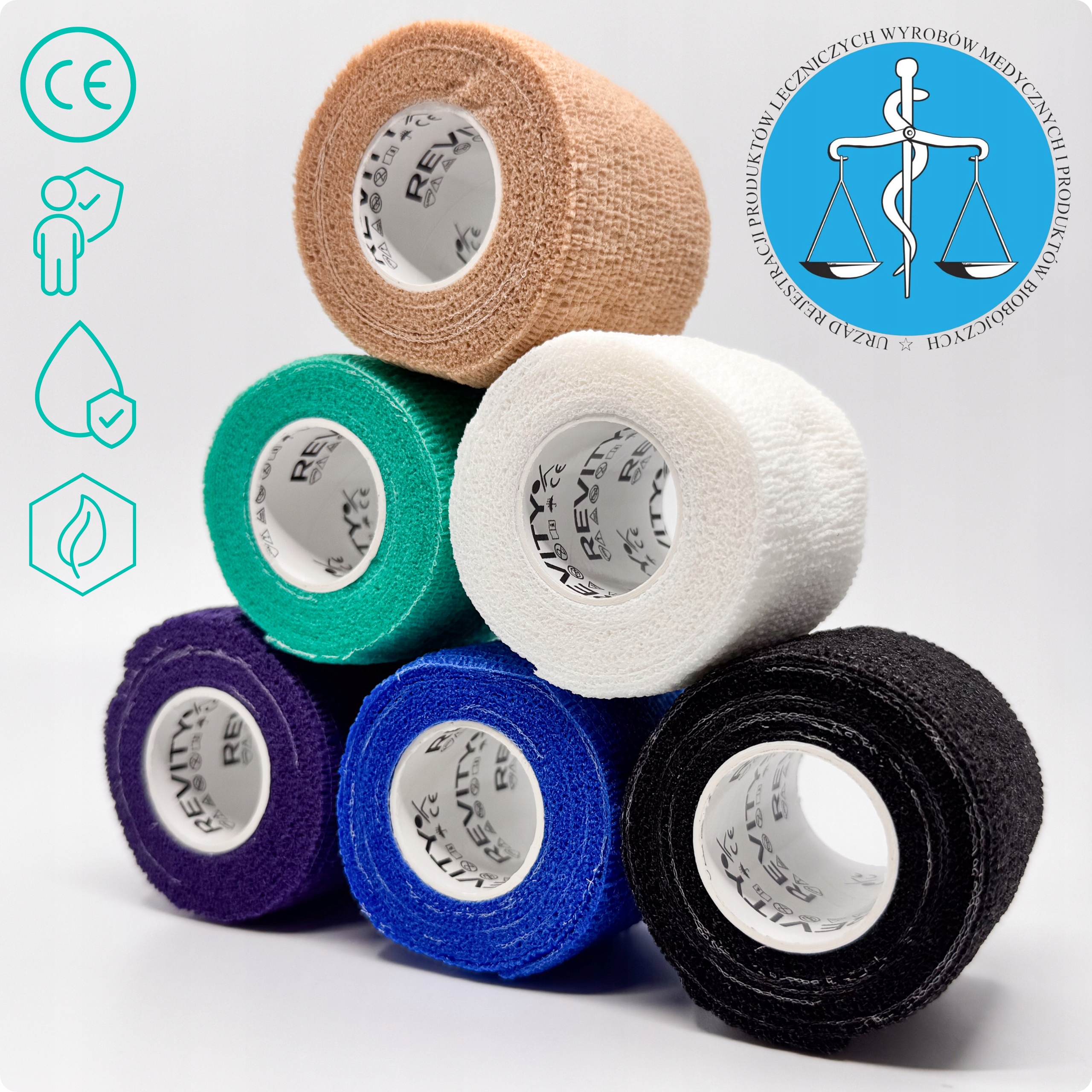 Bandaż kohezyjny REVITY FLEX WRAP to samoprzylepny specjalny rodzaj bandaża, który przylega sam do siebie ale nie przykleja się do skóry, włosów oraz innych powierzchni. Jest przpuszczalny dla powietrza (pozwala skórze oddychać) oraz nie nasiąka wodą, co czyni go praktycznym w różnych sytuacjach.