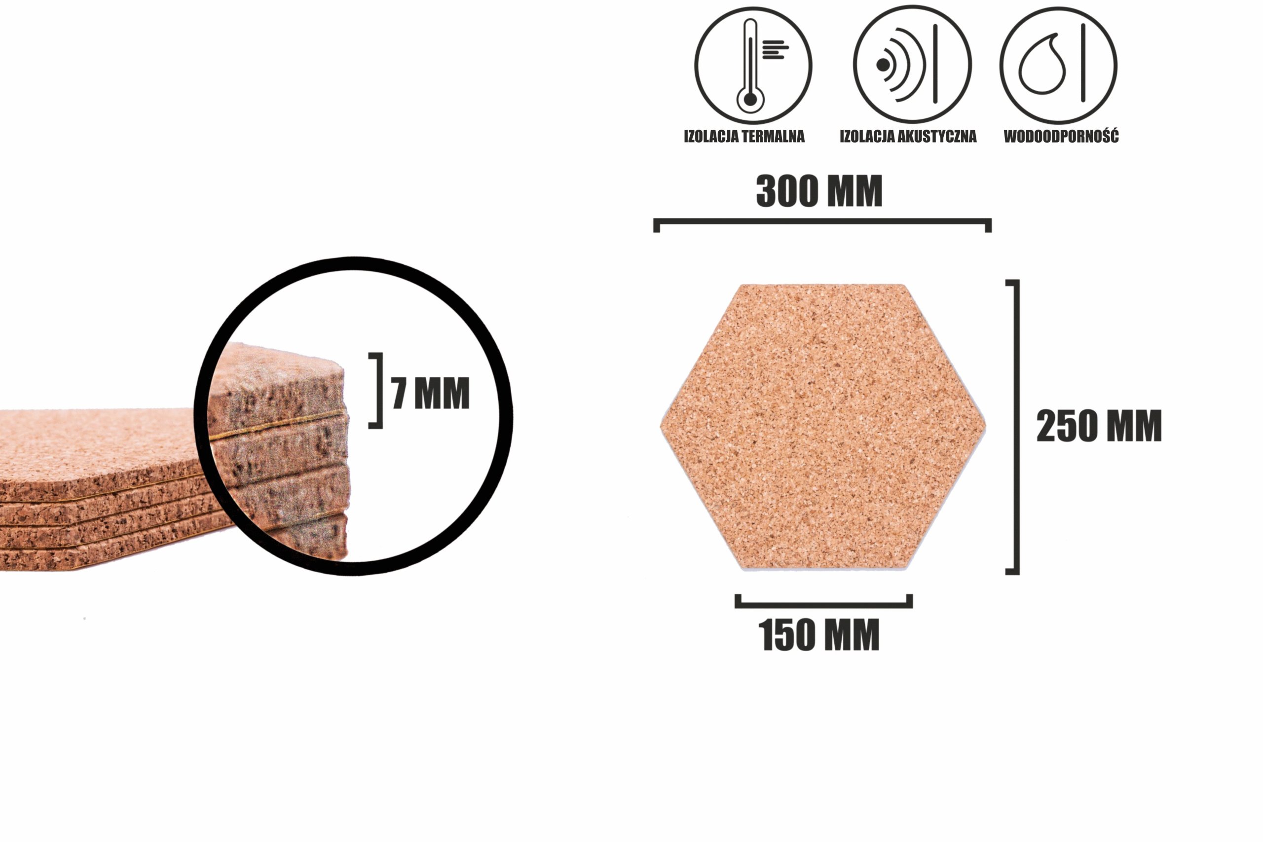 Tabliczka korkowa samoprzylepna 300mmx300mmx7mm naturalna w kształcie sześciokąta znajdująca się w naszej ofercie została obłożona klejem, który zabezpieczono folią. Korek samoprzylepny jest niezwykle prosty w użyciu, gdyż należy jedynie ściągnąć folię z tablicy korkowej i usytuować w dogodnym dla siebie miejscu. Klej jest bezzapachowy i błyskawicznie schnący, co sprawia, że z chęcią używa go wiele zainteresowanych osób. Krawędzie są szlifowane pod kątem 45stopni, tak aby przy łączeniu ze sobą elementów pasowały do siebie idealnie, dając finalnie estetyczny wygląd.