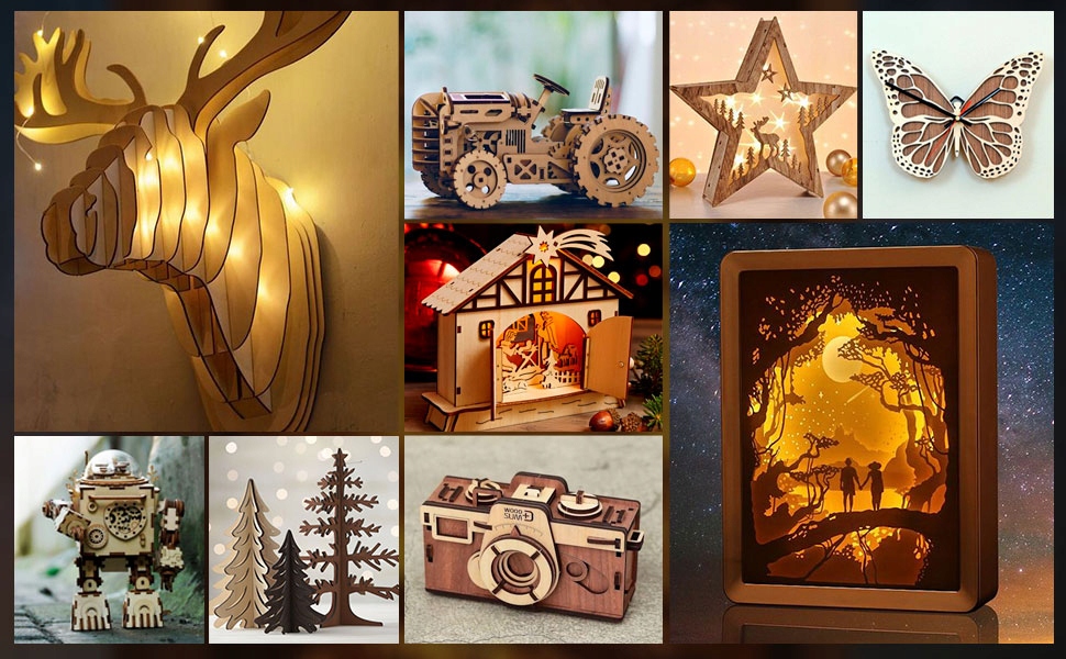 Materiały do cięcia: karton, włóknina, jasne drewno, materiał akrylowy, cienka plastikowa deska.