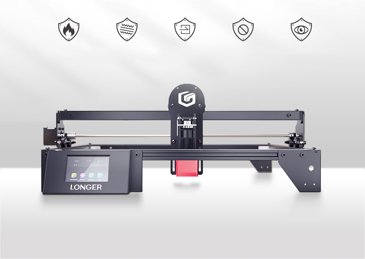 LONGER RAY5 został zaprojektowany z funkcjami ochrony ruchu i ochrony termicznej. Jeśli maszyna zostanie przesunięta w trakcie użytkowania, funkcja Move Protection zainicjuje automatyczne wyłączenie dla bezpieczeństwa osobistego. Ochrona termiczna inicjuje automatyczne wyłączenie w przypadku wykrycia płomienia lub przegrzania obszaru grawerowania.