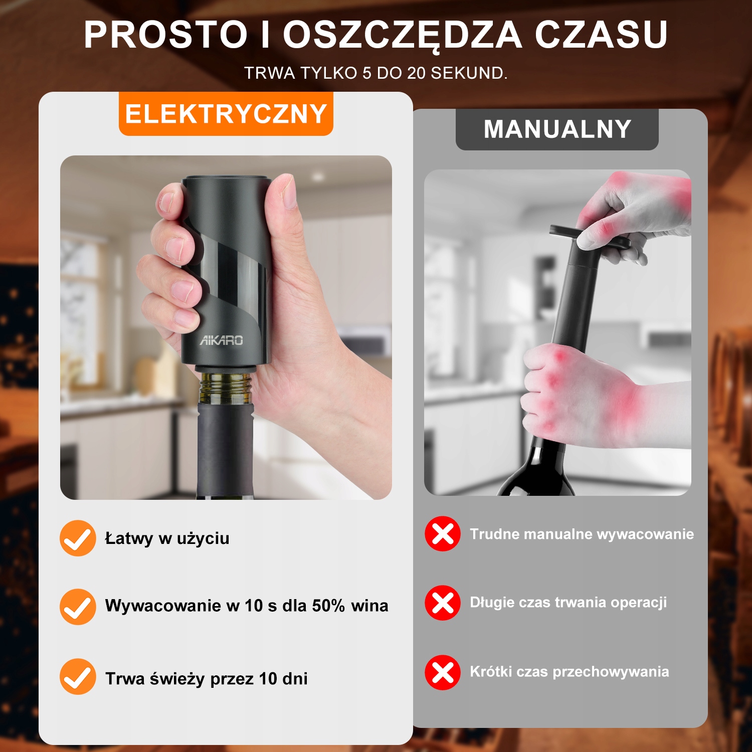 BEZPROBLEMOWA OBSŁUGA: Elektryczna pompa do wina vacuvin szybko usuwa powietrze z butelki wina i automatycznie wyłącza się, gdy wykryje, że próżnia osiąga - 0.02 MPa.