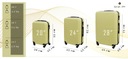 - wymiar zewnętrzny obejmuje wszystkie wystające elementy walizki: kółka, stopki, zamek szyfrowy, uchwyty do przenoszenia, ale nie obejmuje wysuwanego stelaża.