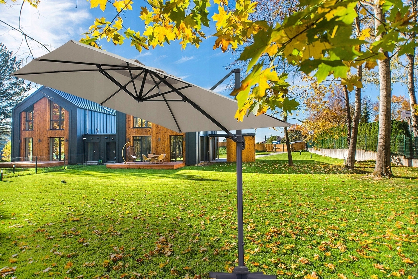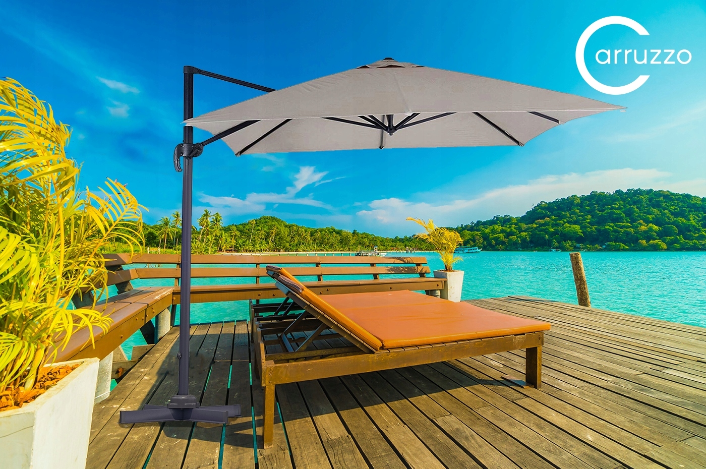 Parasol na wysięgniku wykonany z wytrzymałego poliestru.
