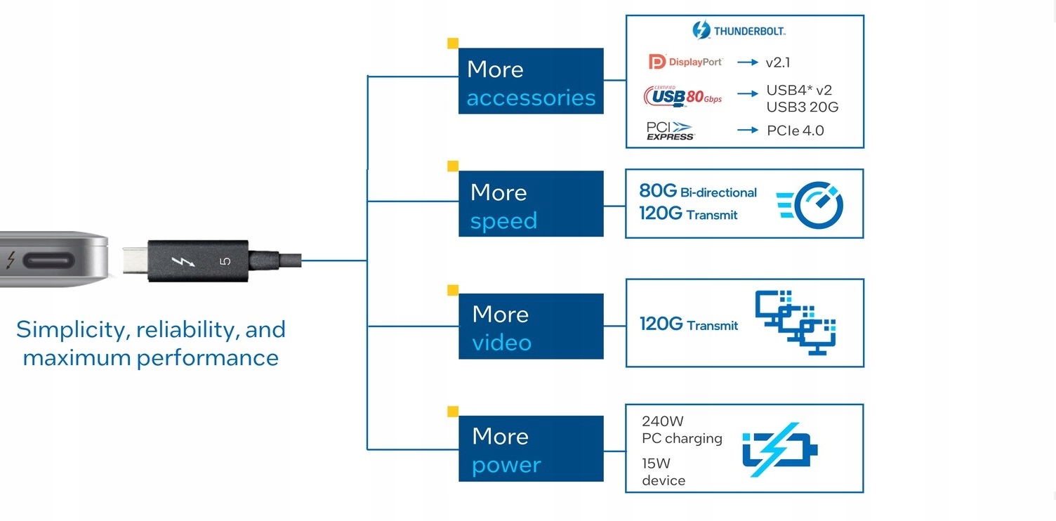 Thunderbolt 5 Cable pozwala z łatwością sprostać rosnącym wymaganiom nowoczesnych systemów komputerowych w zakresie szybkości transferu danych, wydajności wyświetlania i zasilania. Ważne jest również podłączenie wszystkich istniejących urządzeń, które mają przed sobą lata użytkowania. Dlatego też kabel Thunderbolt 5 w pełni obsługuje wszystkie niesamowite funkcje Thunderbolt 5, a jednocześnie jest w pełni kompatybilny wstecz z hostami i urządzeniami Thunderbolt 4, Thunderbolt 3, USB4 i USB-C.