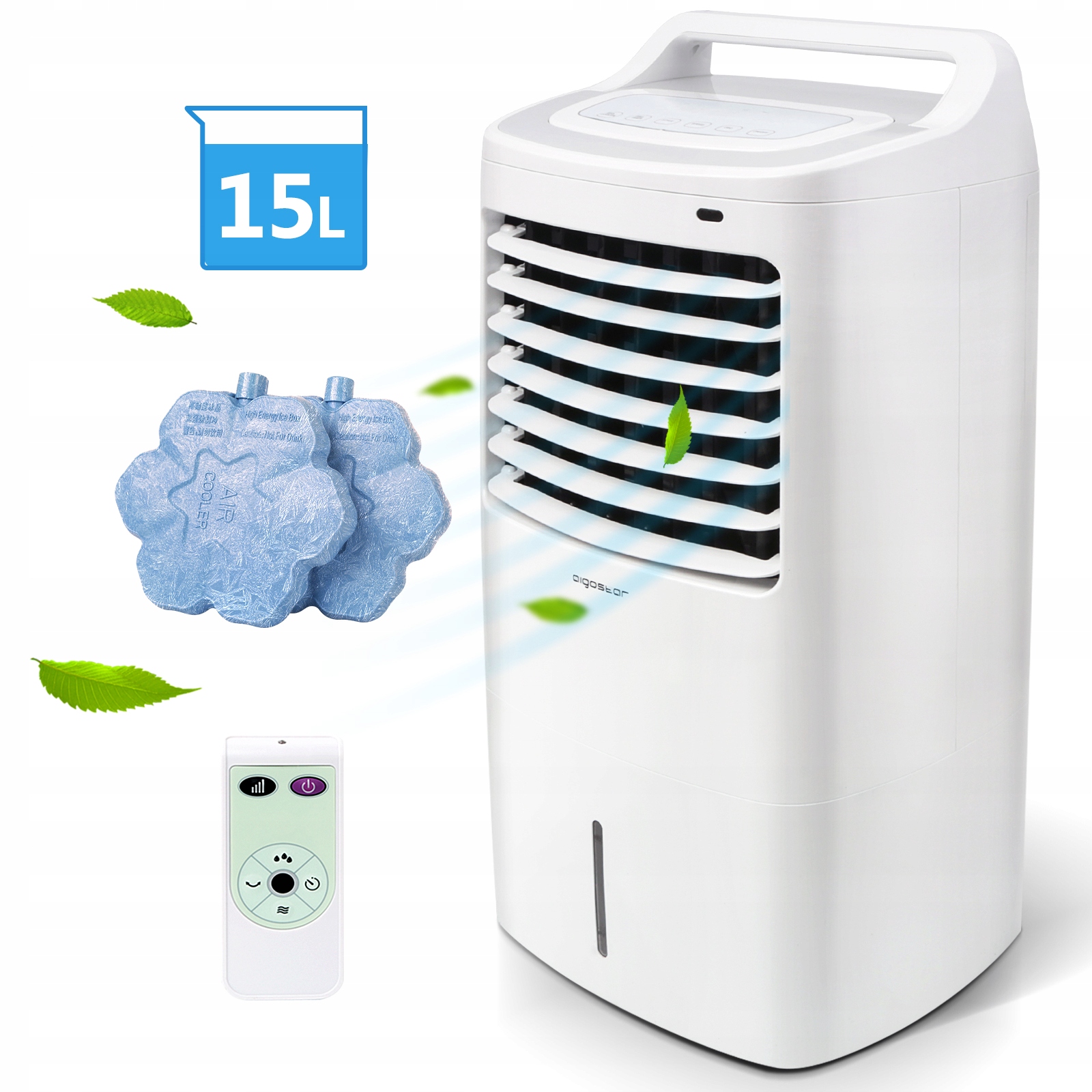 Wielofunkcyjne urządzenie: schładza powietrze, nawilża, oczyszcza. 15 litrowy zbiornik na wodę zapewnia chłodne powietrze przez 8-9 godzin. 2 pojemniki lód poprawiają wydajność urządzenia