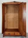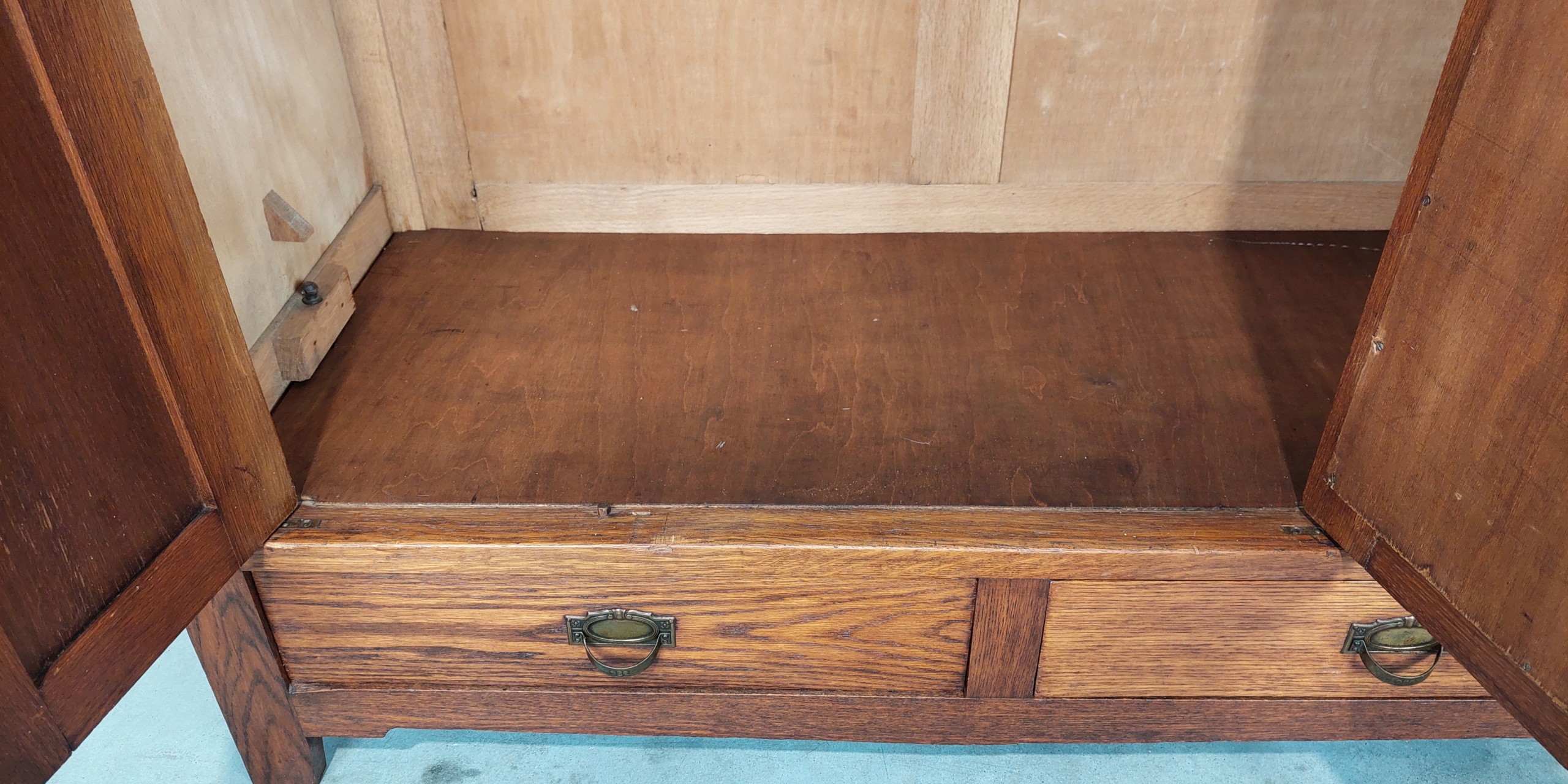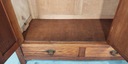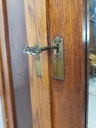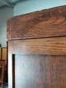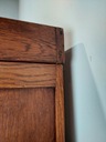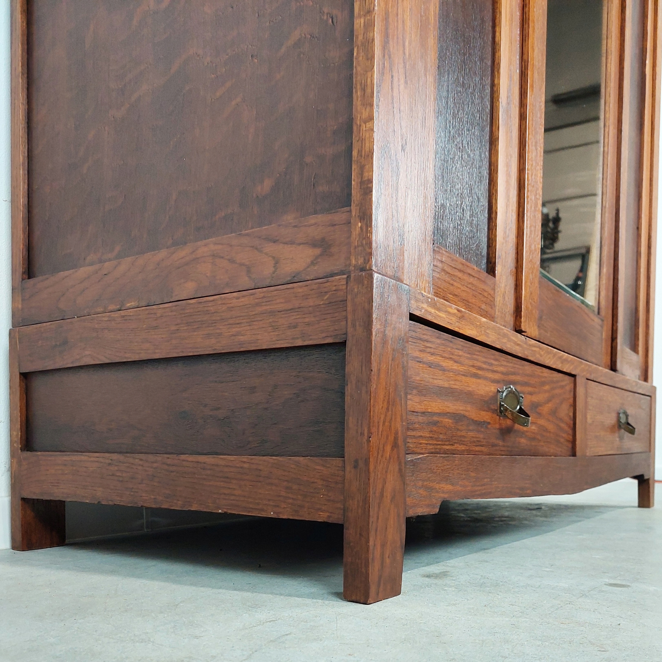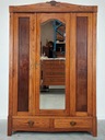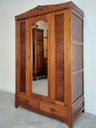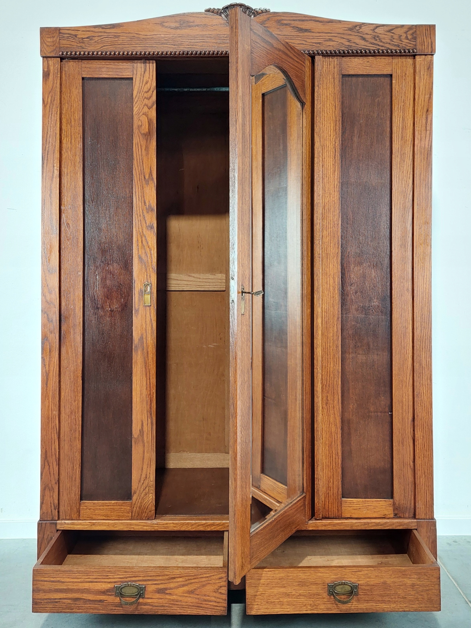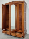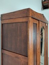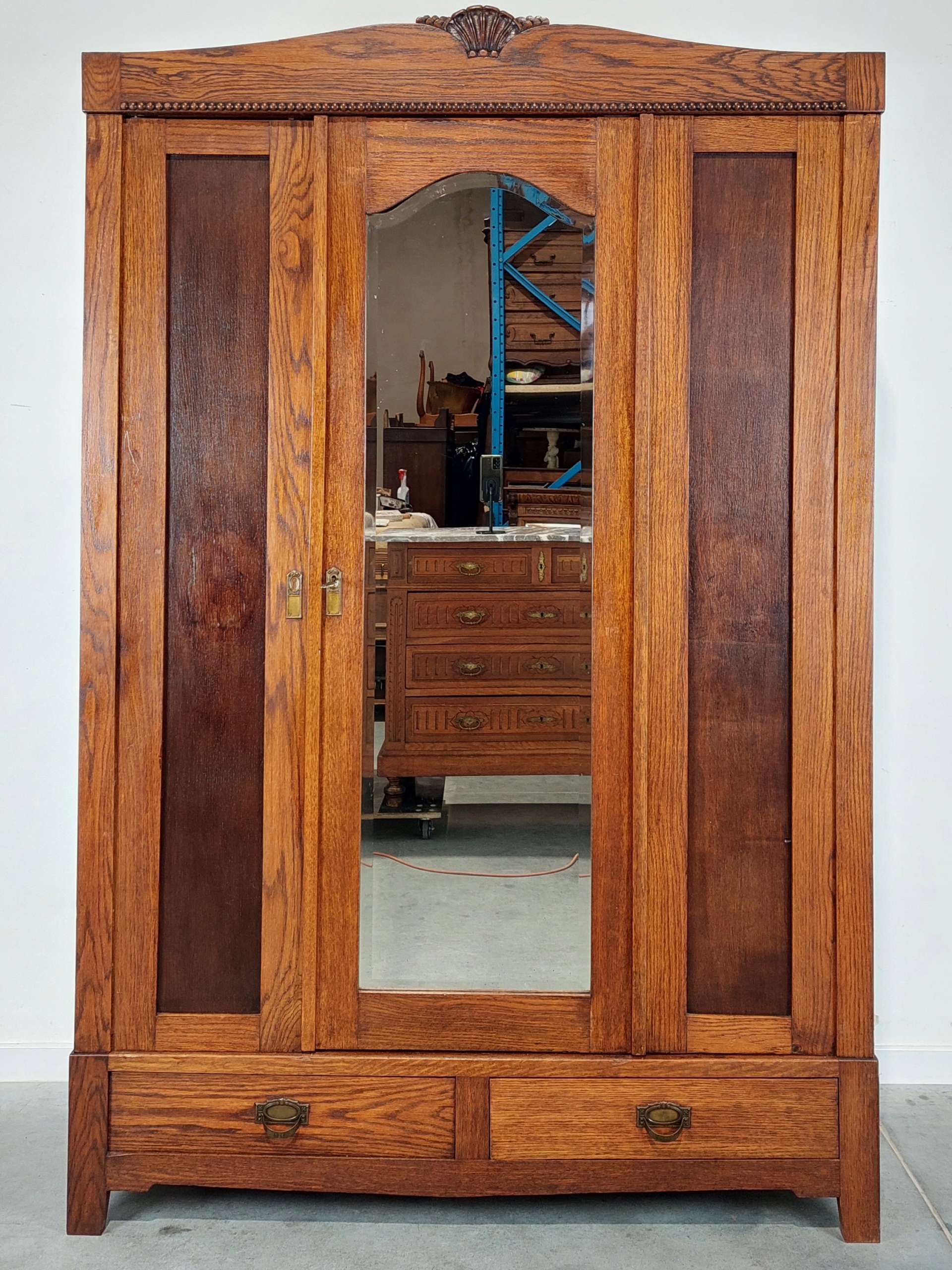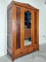 Stylowa trzydrzwiowa szafa - garderoba secesyjna konstrukcja z dębiny, wypełnienia fornir dębowy. Szafa przywieziona z Francji datowana na 1923 r ( sygnatura do wglądu na zdjęciach). Mebel posiada typowe ślady użytkowe/ napraw, widoczne na zdjęciach ( przebarwienia, otarcia, ryski). Wewnątrz praktycznie rozwiązana przestrzeń, pałąk na całej szerokości, plus dwie pojemne szuflady. Zamek sprawny klucz w zestawie. Drzwi lewe oraz środkowe otwierają się, natomiast drzwi prawe są nieruchome. Szafa jest rozkładana na czas transportu. Szczegółowe zdjęcia poniżej.