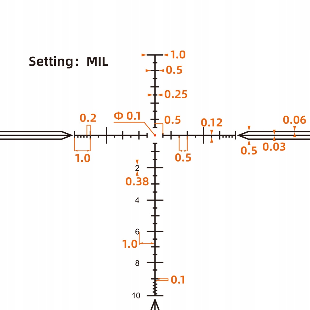 Dane techniczne: Typ siatki celowniczejMPX1 Pozycja siatkiPierwszy an (FFP) Zakres powiększeniaod 5x do 30x Średnica obiektywu56 mm Pojedynczy klik regulacji krzyż1/10 MIL Zakres regulacji krzyża w pionie17,5 MIL Zakres regulacji krzyża w poziomie16 MIL Odległość od oka95 mm Regulacja paralaksy18,2 m do ∞ Średnica tubusu30 mm Długość394,5 mm Odporność na wstrząsy1000 G Klasa szczelnościIP67 Waga924 g KolorCzarny