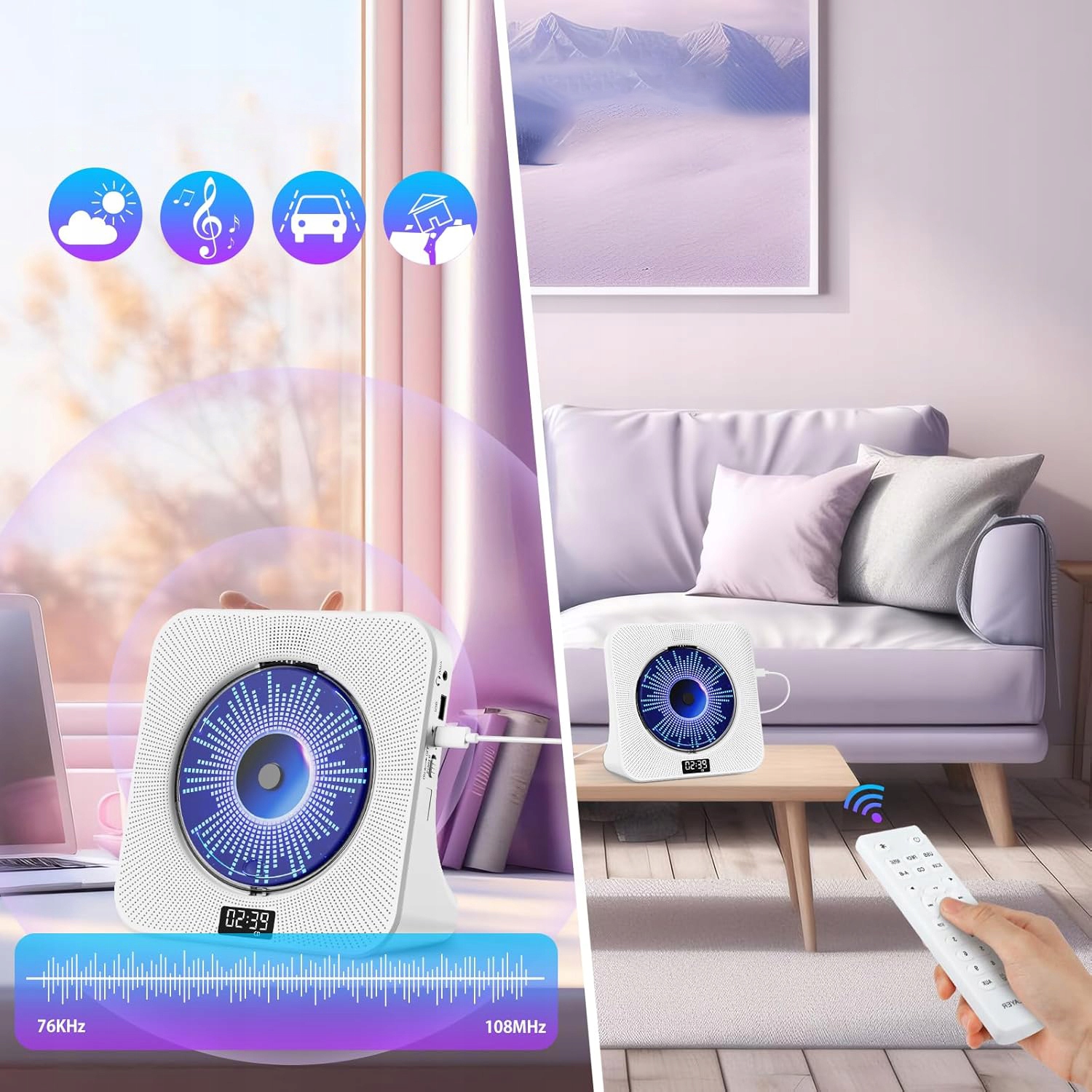 🌷 Odtwarzacz CD z radiem: Jako odtwarzacz CD obsługuje formaty audio CD, CD-R, CD-RW, MP3, WMA. Ponadto możesz cieszyć się czasem radia FM, ustawiając tryb na tryb FM, słuchać wszystkich kanałów informacji pogodowych, wiadomości, ruchu drogowego i muzyki w swoim czasie. Zakres kanałów wynosi 76-108,0 MHz. Funkcja FM obejmuje również funkcję automatycznego wyszukiwania, która szybko znajduje i zapisuje wszystkie dostępne stacje. UWAGA: Nie można ręcznie zapisywać stacji.