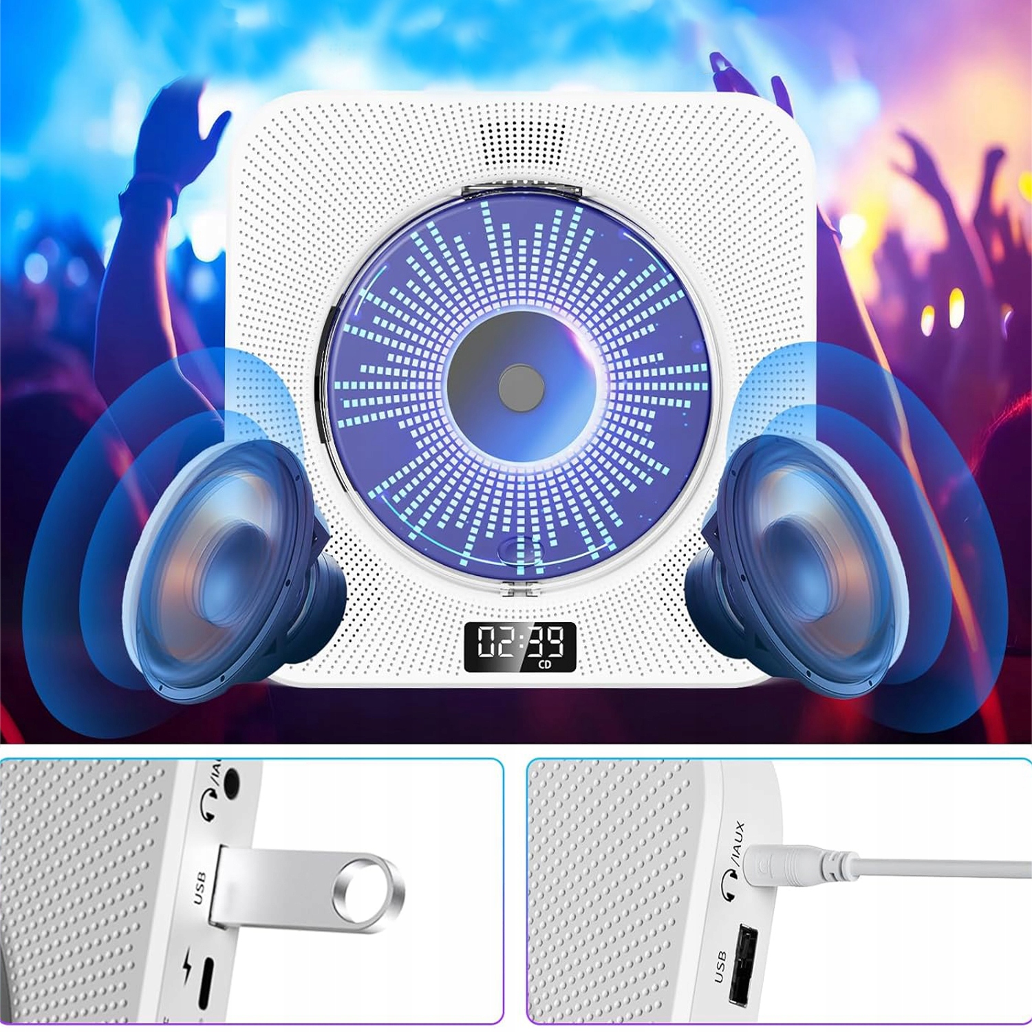 🌷 Odtwarzacz CD z głośnikiem: Odtwarzacz CD jest wyposażony w dwa głośniki Hi-Fi, jakość dźwięku jest głośna i wyraźna, możesz dzielić się swoimi ulubionymi utworami ze znajomymi w dowolnym momencie, jest idealnym prezentem dla dzieci, osób starszych, rodziców i przyjaciół itp. Podłącz odtwarzacz CD do innych zewnętrznych urządzeń przewodowych, takich jak telefony komórkowe, tablety lub laptopy za pomocą kabla audio 3,5 mm, a następnie będzie działał jako przewodowy głośnik.