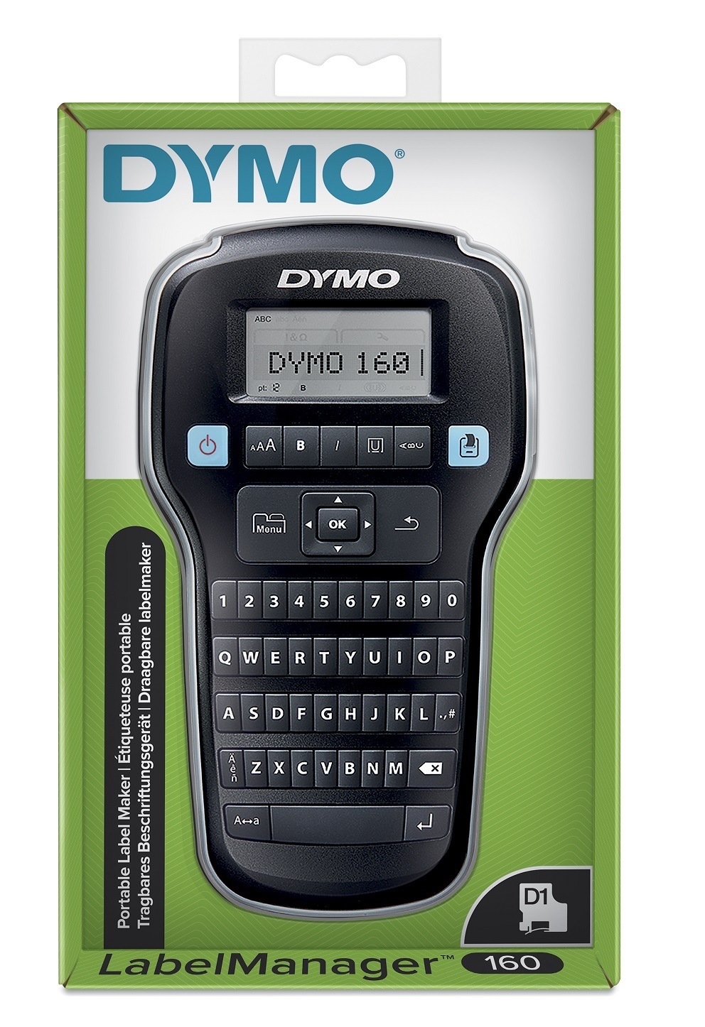 Przenośna drukarka etykiet DYMO LabelManager LM160 z klawiaturą QWERTY i wyświetlaczem LCD, umożliwiająca szybkie i łatwe tworzenie profesjonalnych etykiet. W zestawie taśma D1 12mm biała z czarnym nadrukiem.