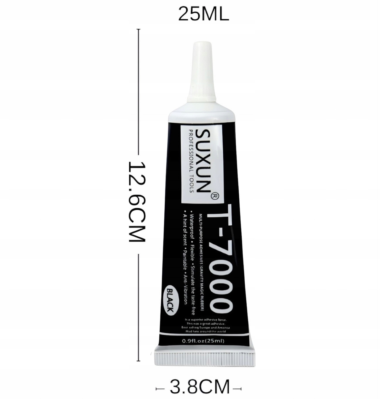 Uniwersalny klej T7000 to doskonały środek do naprawy obudów i ekranów dotykowych w telefonach. Nadaje się również do klejenia i reperowania innych przedmiotów. Za pomocą cienkiego dozownika można nakładać precyzyjne warstwy na nawet male powierzchnie. Kiedy zastygnie wytwarza elastyczną ale odporną na zewnętrzne warunku gumę.
