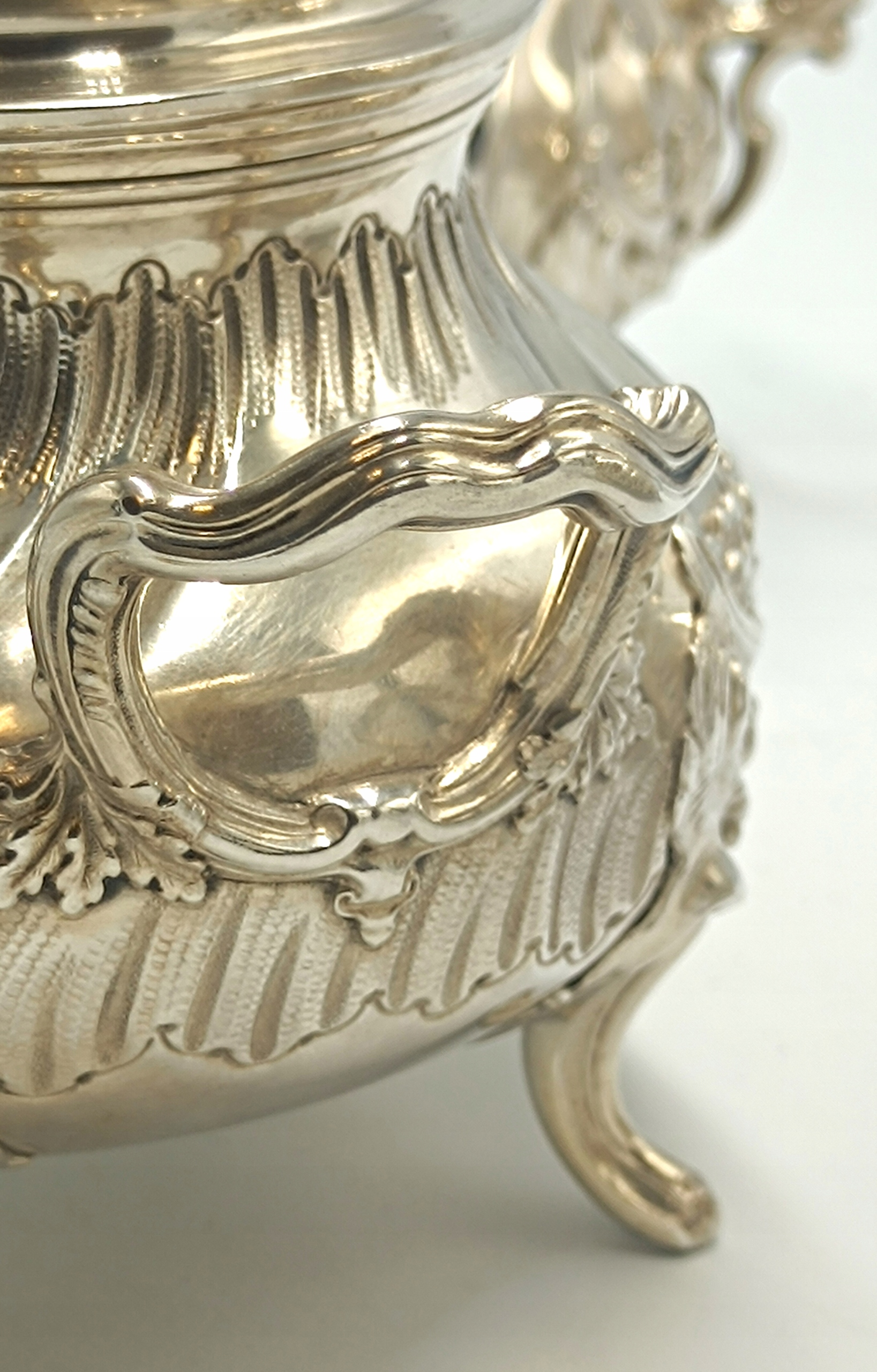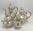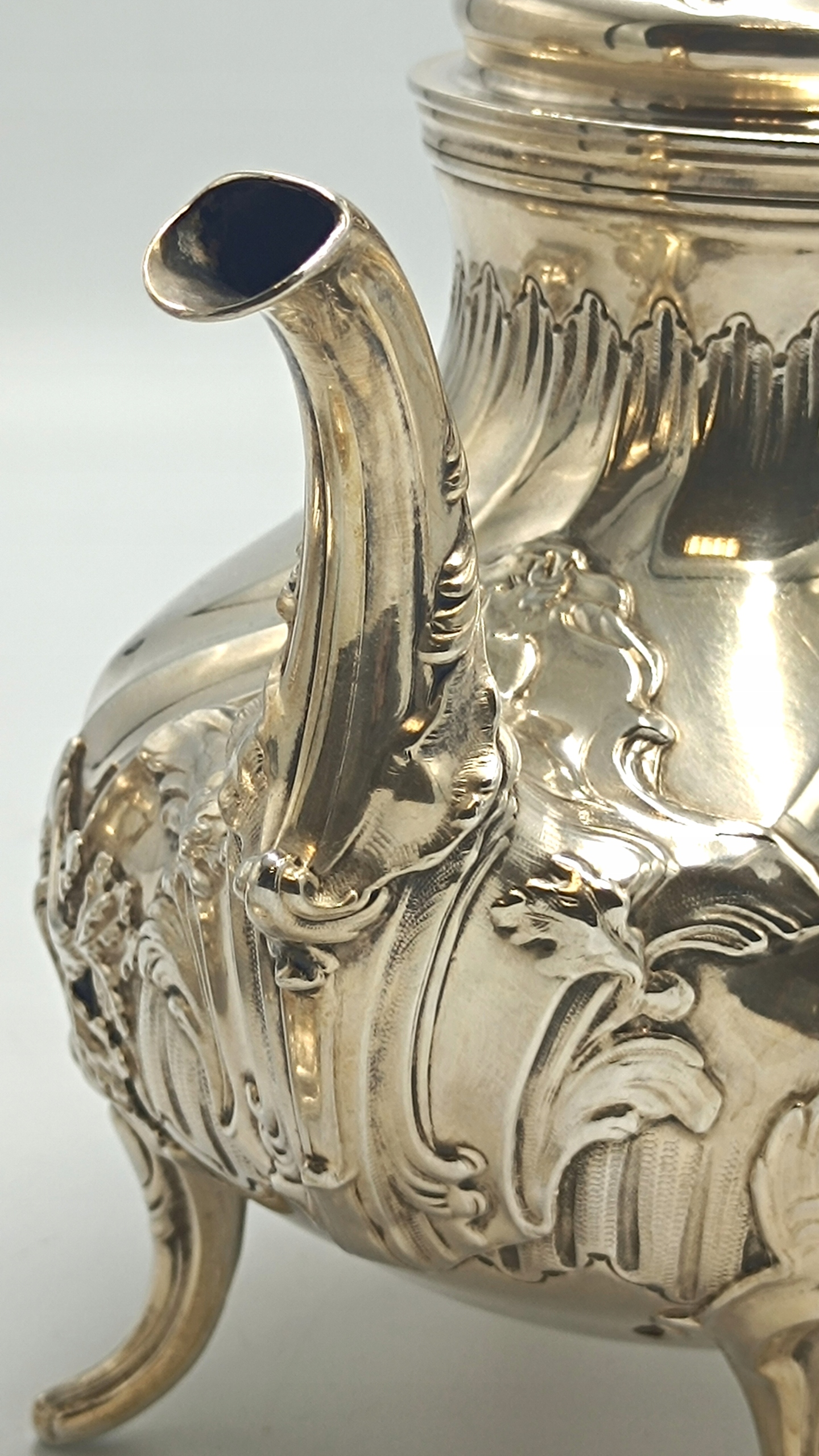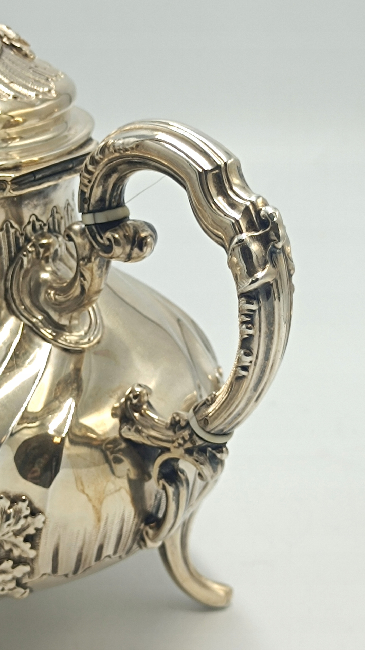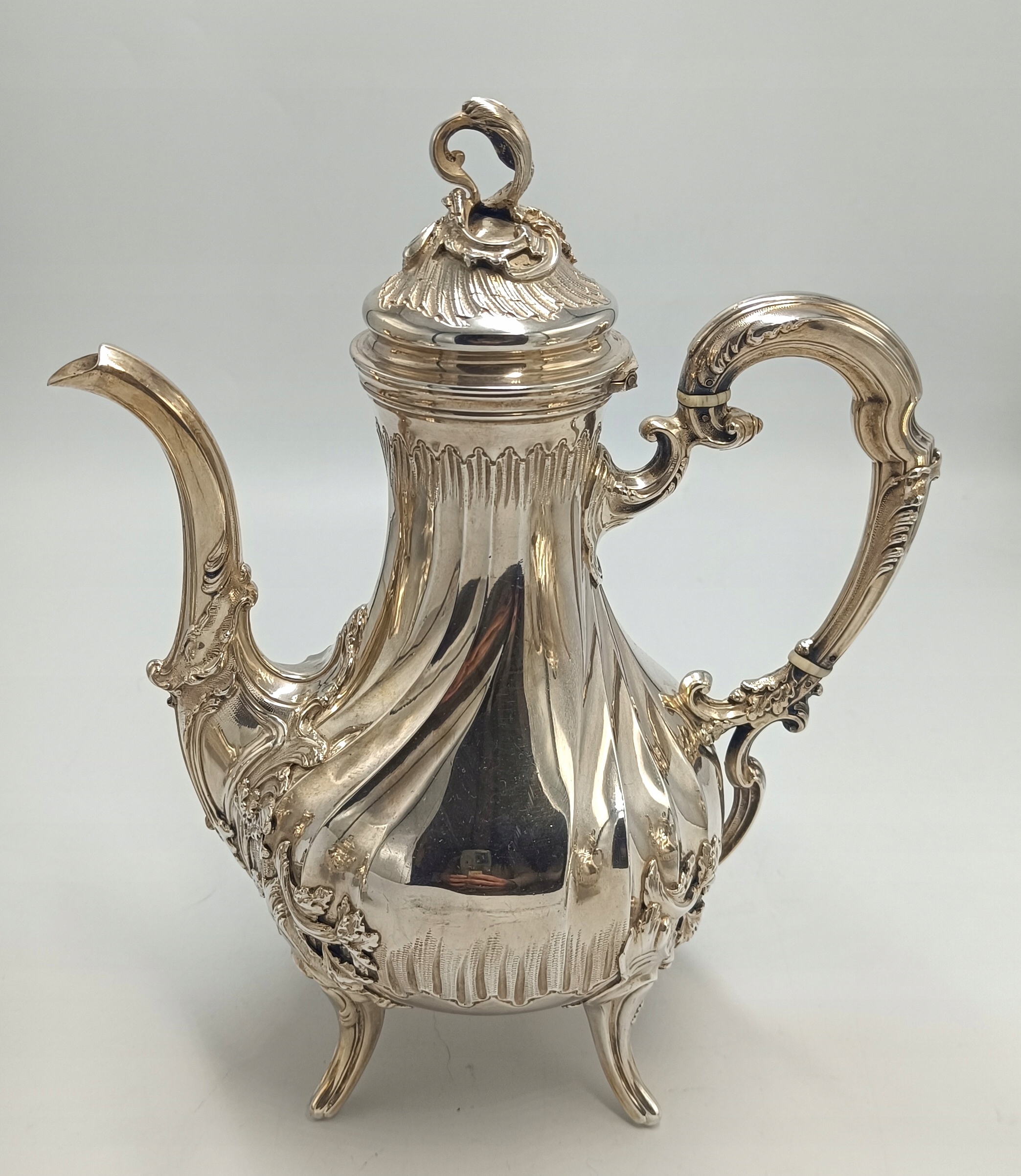 Мы представляем восхитительный старинный чайный и кофейный сервиз, сделанный полностью из серебра испытания 950 о чем свидетельствует пунка с головой Минервы и числом 1 справа от нее сторона.