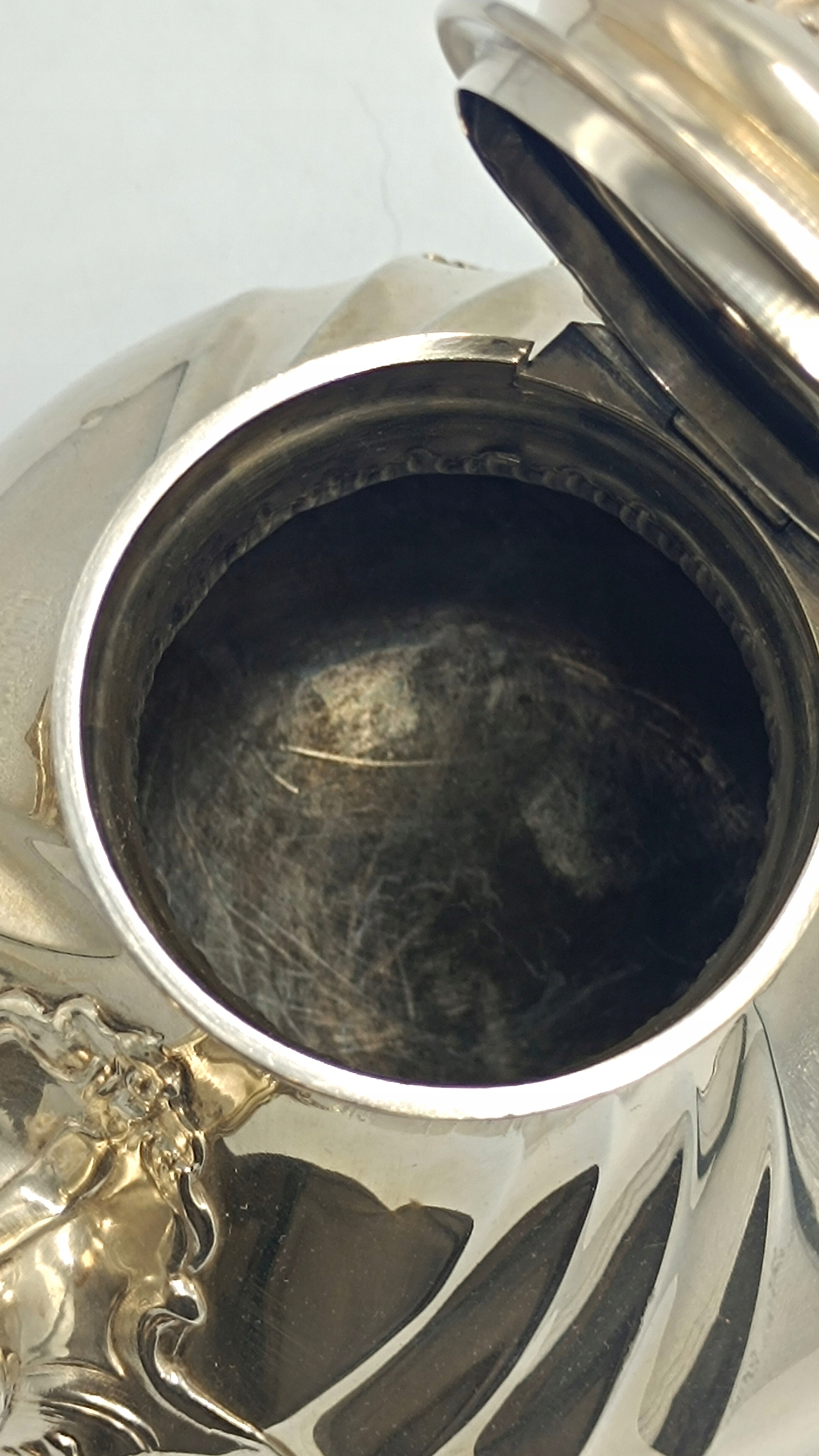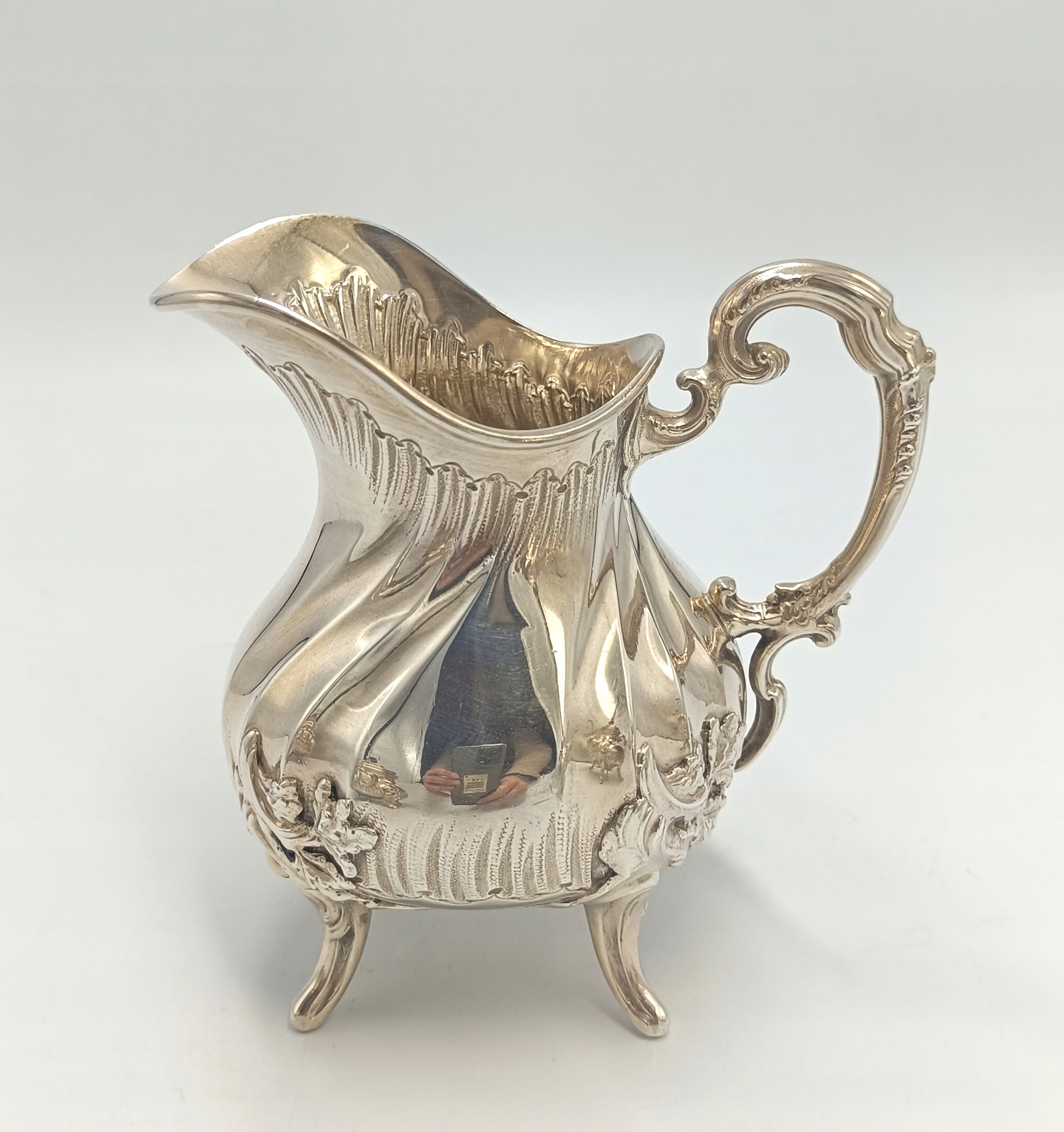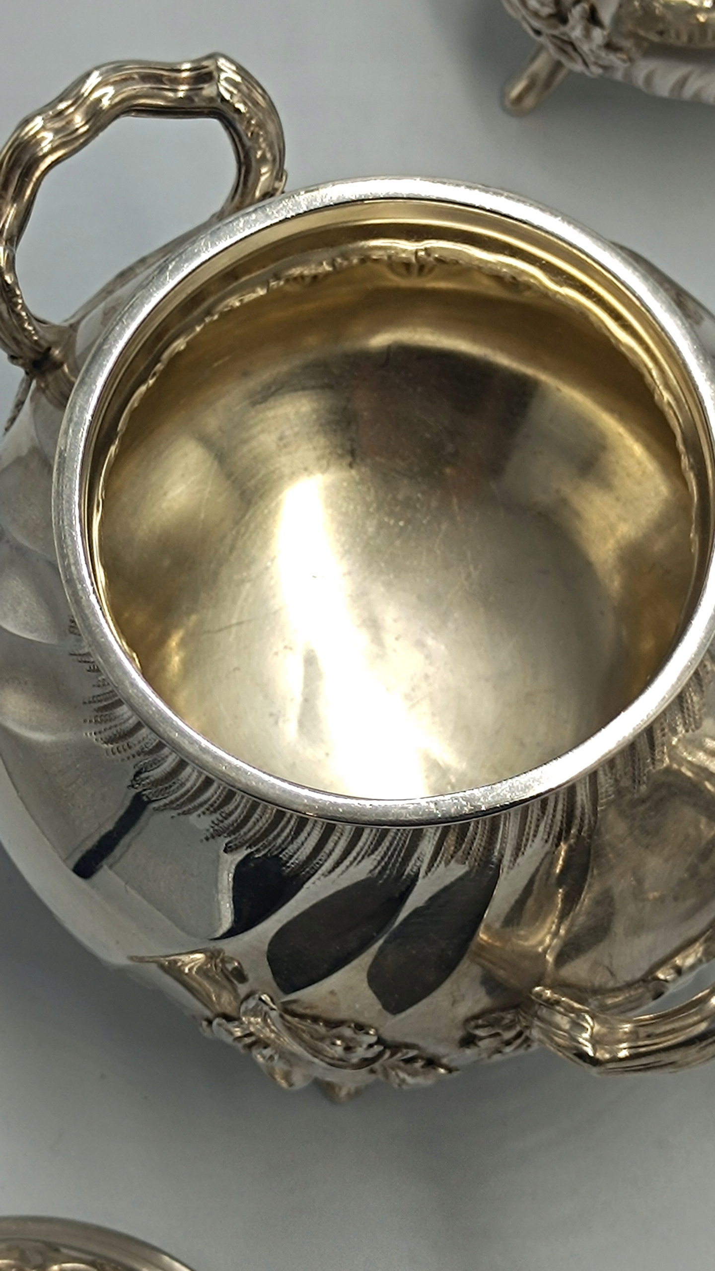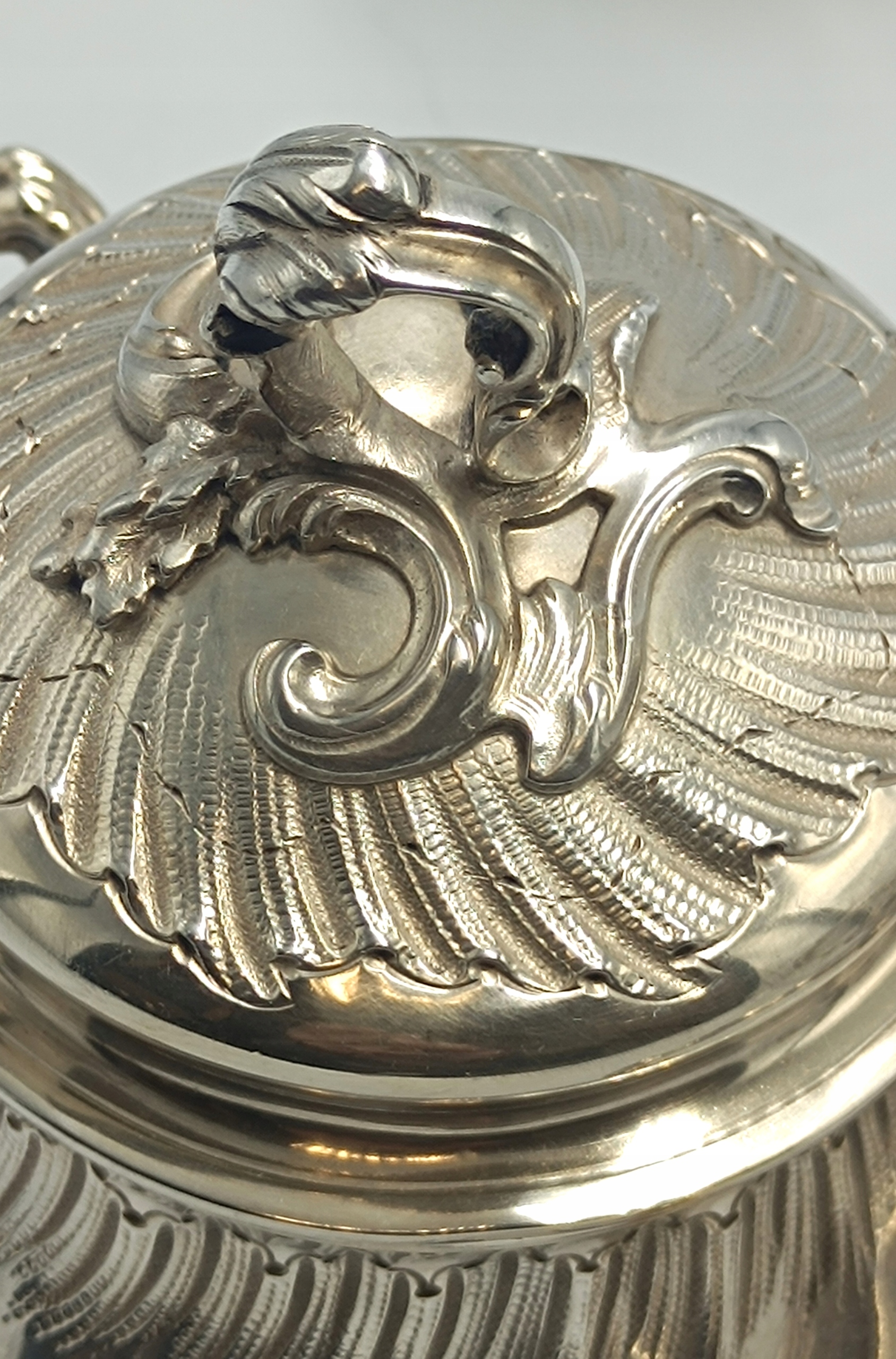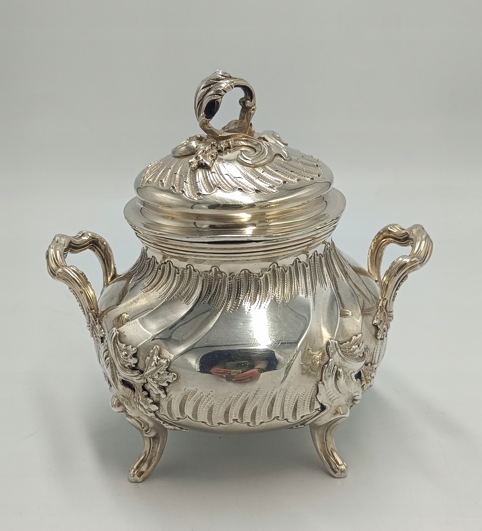 Мы представляем восхитительный старинный чайный и кофейный сервиз, сделанный полностью из серебра испытания 950 о чем свидетельствует пунка с головой Минервы и числом 1 справа от нее сторона.