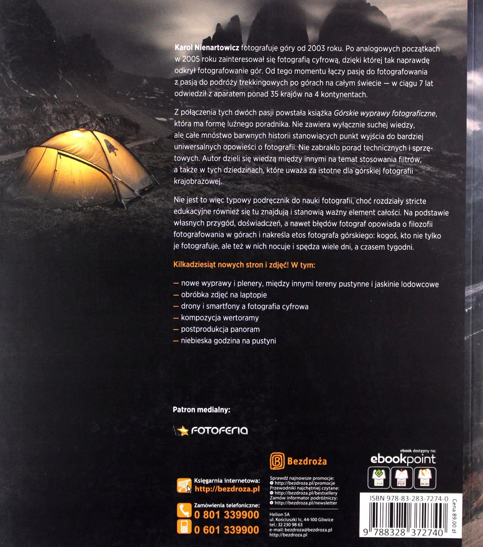 Karol Nienartowicz fotografuje góry od 2003 roku. Po analogowych początkach w 2005 roku zainteresował się fotografią cyfrową, dzięki której tak naprawdę odkrył fotografowanie gór. Od tego momentu łączy pasję do fotografowania z pasją do podróży trekkingowych po górach na całym świecie - w ciągu 7 lat odwiedził z aparatem ponad 35 krajów na 4 kontynentach. Z połączenia tych dwóch pasji powstała książka Górskie wyprawy fotograficzne, która ma formę luźnego poradnika. Nie zawiera wyłącznie suchej wiedzy, ale całe mnóstwo barwnych historii stanowiących punkt wyjścia do bardziej uniwersalnych opowieści o fotografii. Nie zabrakło porad technicznych i sprzętowych. Autor dzieli się wiedzą między innymi na temat stosowania filtrów, a także na te tematy, które uważa za istotne dla górskiej fotografii krajobrazowej. Nie jest to więc typowy podręcznik do nauki fotografii, choć rozdziały stricte podręcznikowe również się tu znajdują i stanowią ważny element całości. Na podstawie własnych przygód, doświadczeń, a nawet błędów fotograf opowiada o filozofii fotografowania w górach i nakreśla etos fotografa górskiego: kogoś, kto nie tylko fotografuje góry, ale też w nich nocuje i spędza wiele dni, a czasem tygodni. Kilkadziesiąt nowych stron i zdjęć! W tym: