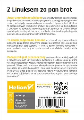Автор известных читателям издательства Helion книг, среди прочего на тему открытой операционной системы подготовлено уже шестое издание руководства по команды и команды Linux. В карманном лексиконе он обсудил использование компьютера с Linux на борту с помощью команд, файловые операции, специальные файлы, каталоги, по ссылкам и каналам, написание собственных сценариев оболочки, поддержка Midnight Commander.