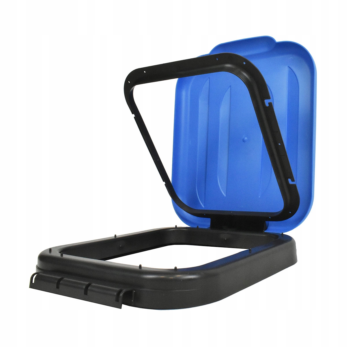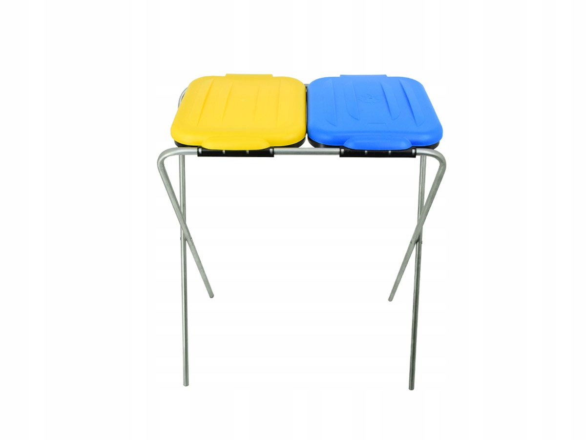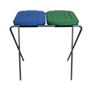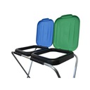 Stojak na śmieci z pokrywami w niebiesko- zielonym kolorze umożliwia segregację odpadów na papier i szkło.