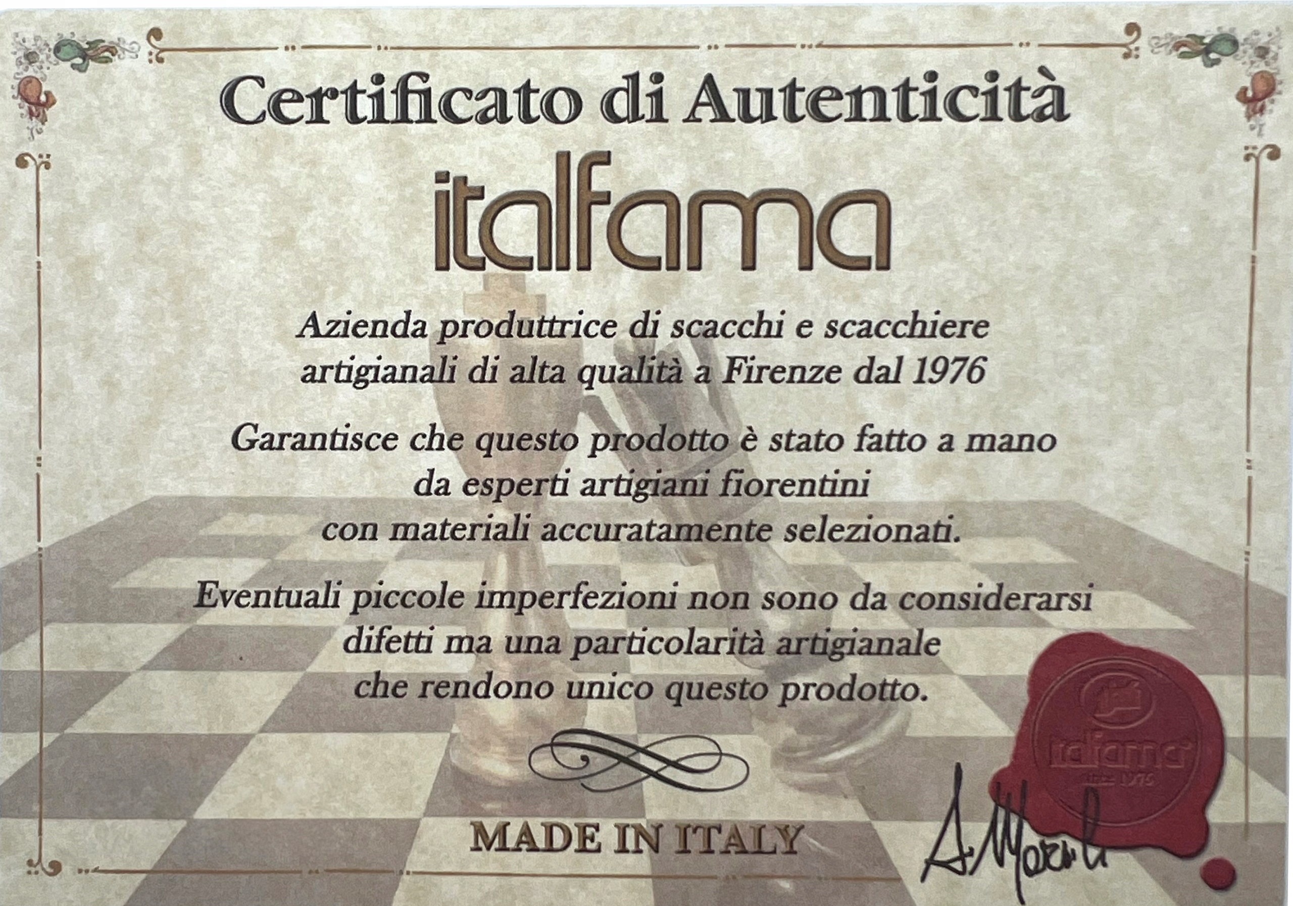 Italfama to światowej klasy producent szachów z Florencji. Od niemal 50 lat tworzy zestawy, które łączą tradycję rzemiosła z artystyczną wizją. Każdy produkt to niezrównana jakość i wyjątkowy styl – doceniane na całym świecie przez kolekcjonerów i miłośników eleganckiej rozrywki.