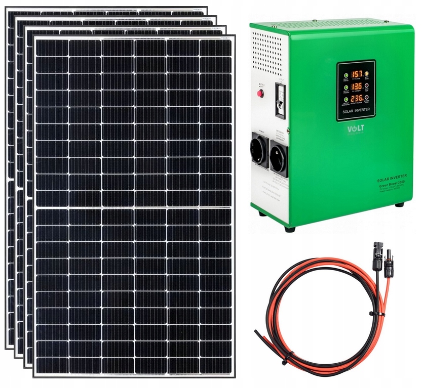 Zestaw składa się z 4 paneli monokrystalicznych PV JA Solar o mocy 500W każdy, przetwornicy VOLT POLSKA Green Boost 3000 oraz kompletnego okablowania o długości 30 metrów zakończonego z obu strony złączami MC4.