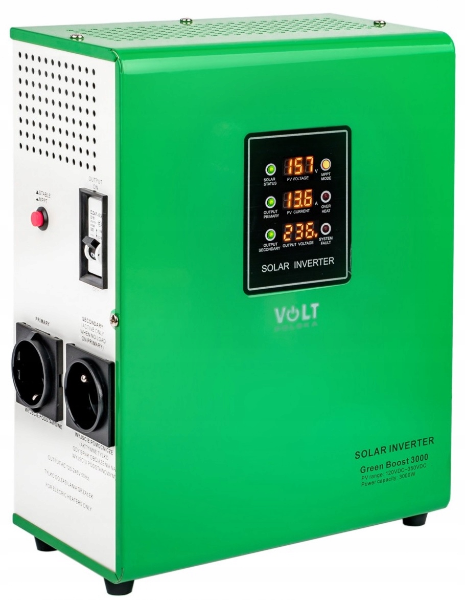Przetwornica VOLT POLSKA Green Boost 3000 pozwala na bezpośrednie zastosowanie systemów paneli fotowoltaicznych do zasilania rezystancyjnych urządzeń grzewczych, takich jak bojlery elektryczne, grzejniki, maty grzewcze itp.