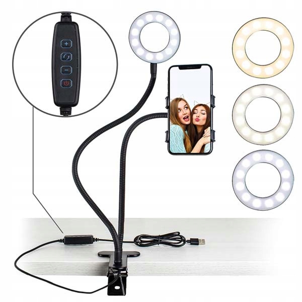 Wyposażona w stabilny statyw o długości 50 cm, który umożliwia różnorodne ustawienia lampy, a także uchwyt na telefon, przymocowany do klipsowego statywu. Idealna do montażu na blacie biurka czy stołu.